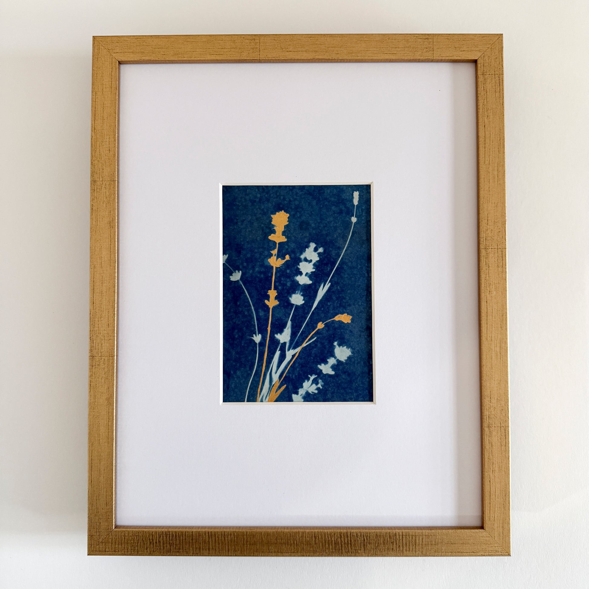 5" x 7" framed in 12" x 15" gold frame with glass, ready to hang