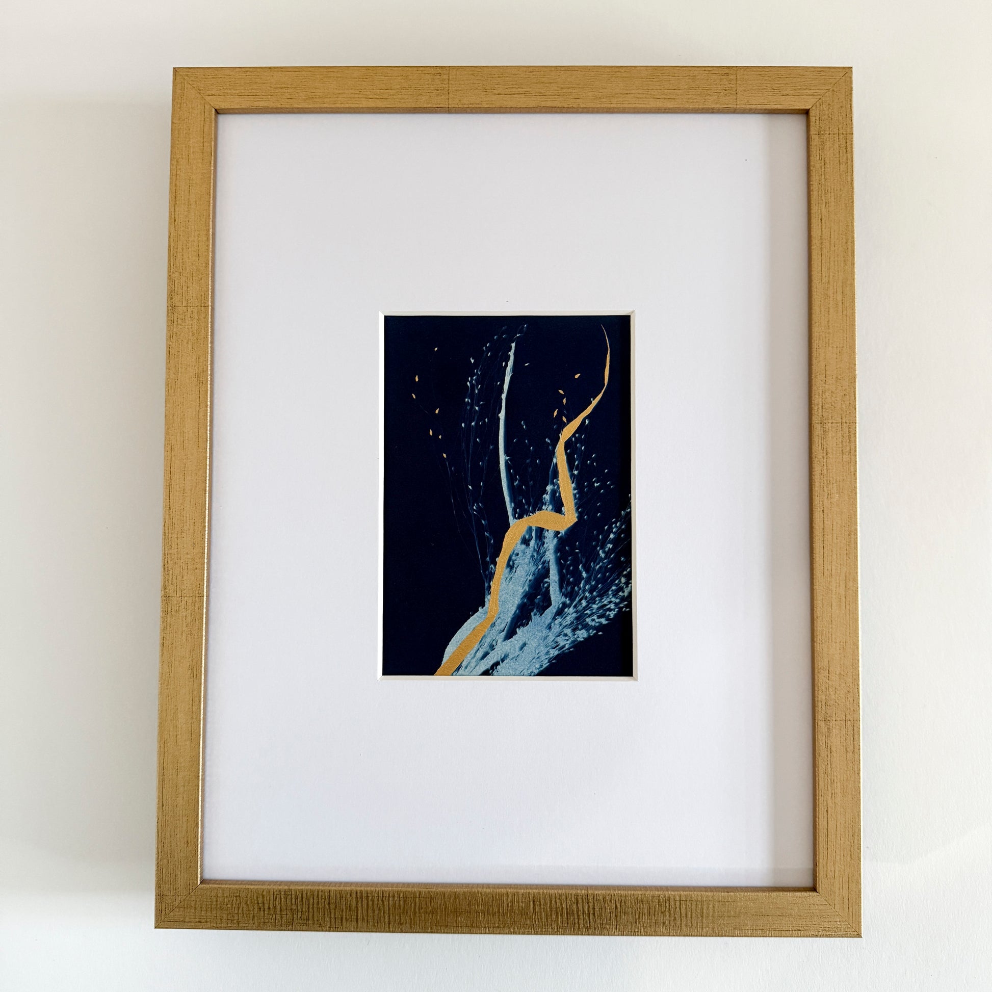 5" x 7" framed in 12" x 15" gold frame with glass, ready to hang