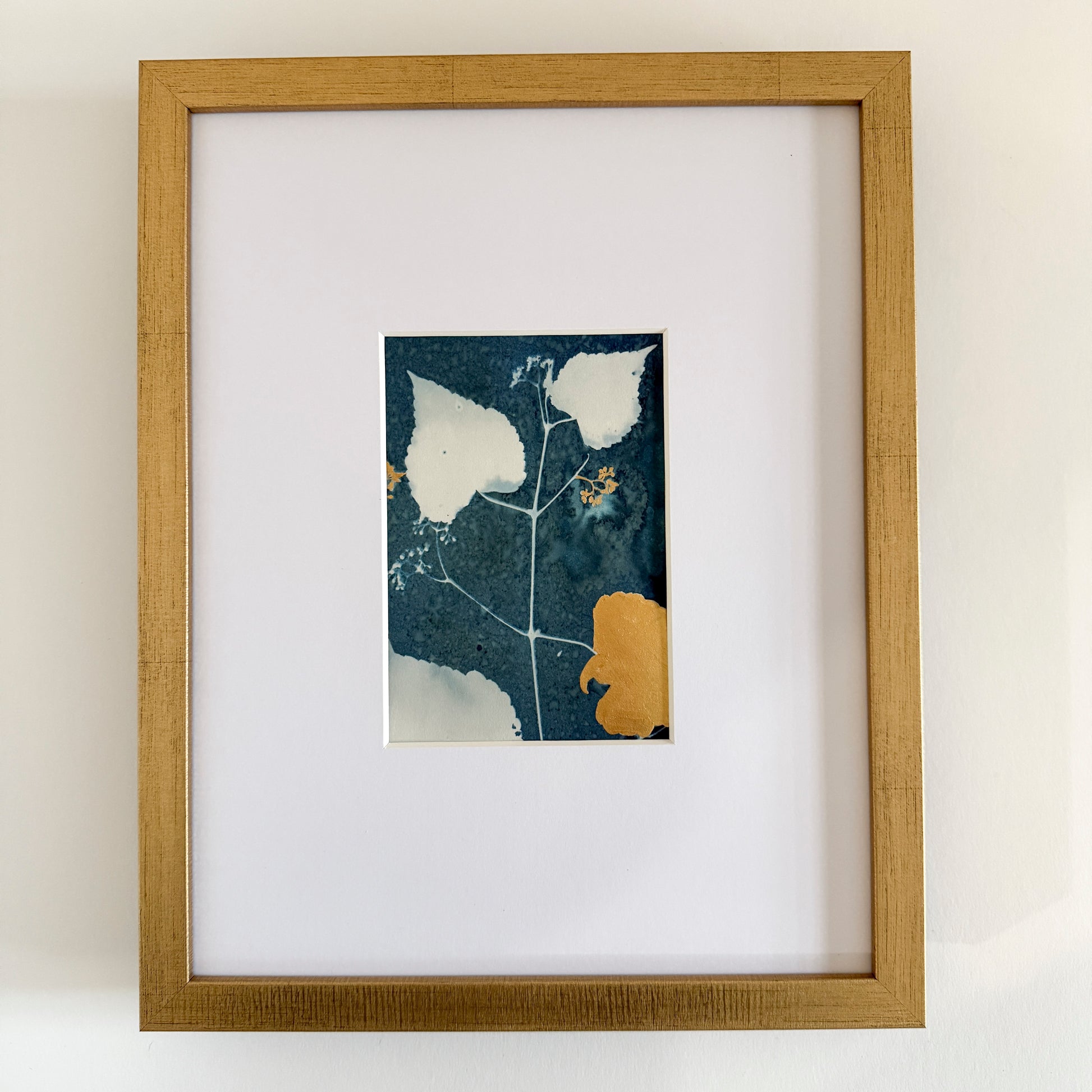 5" x 7" framed in 12" x 15" gold frame with glass, ready to hang