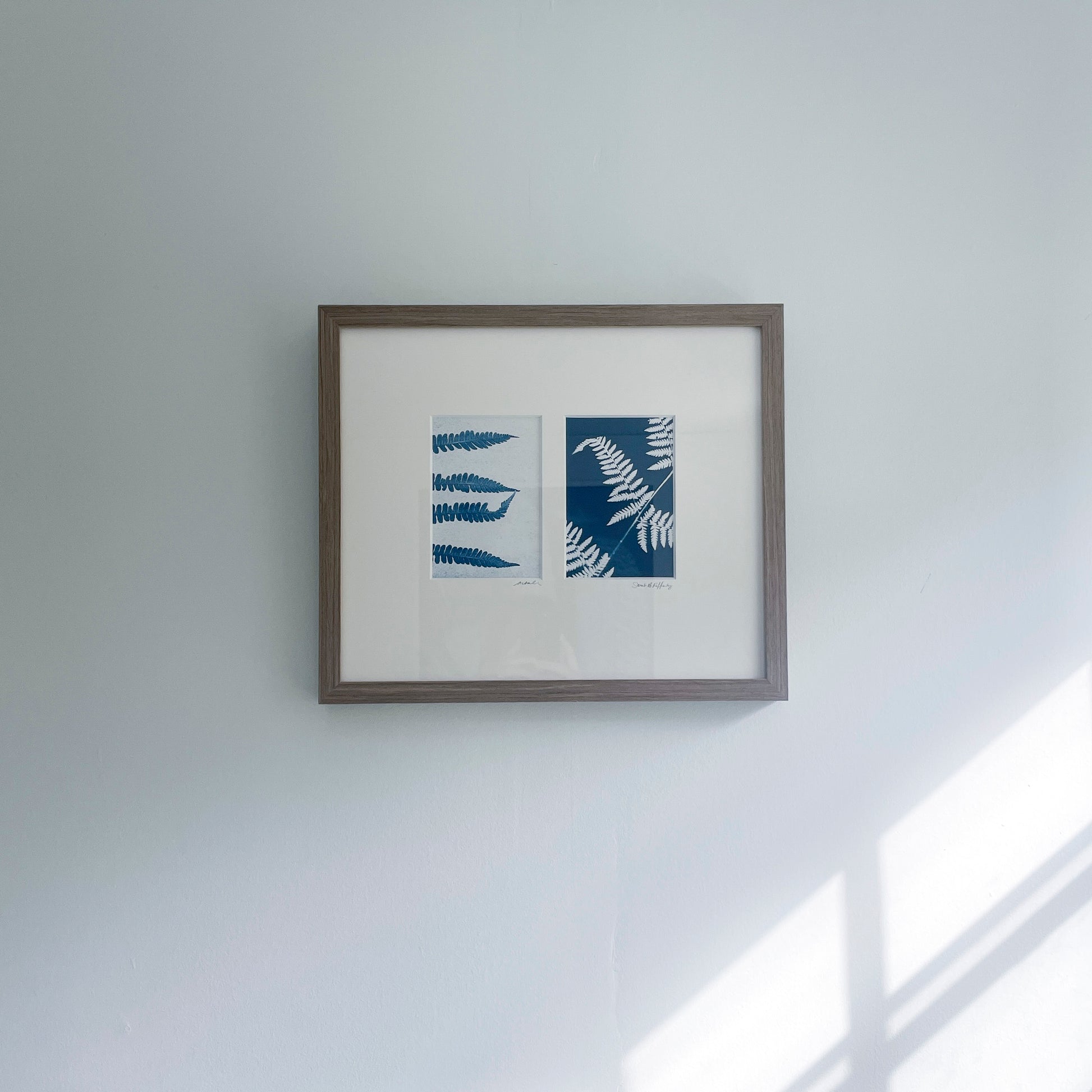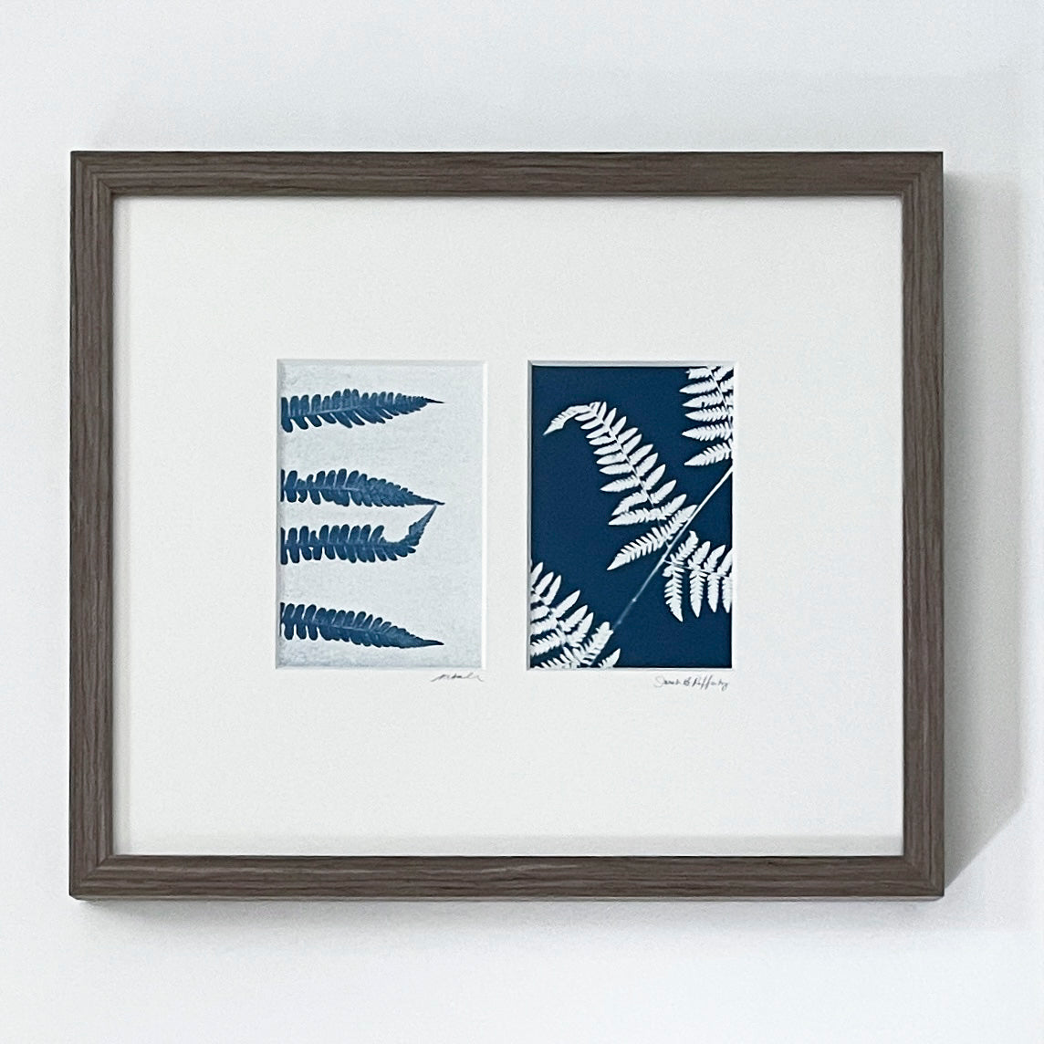 Two 4" x 6" original cyanotypes (professionally framed to 17" x 15") of ferns from my time at Winterthur as Artist in Residence Summer 2024 - each specimen in this collection was hand-selected from the exquisite Winterthur Garden collection