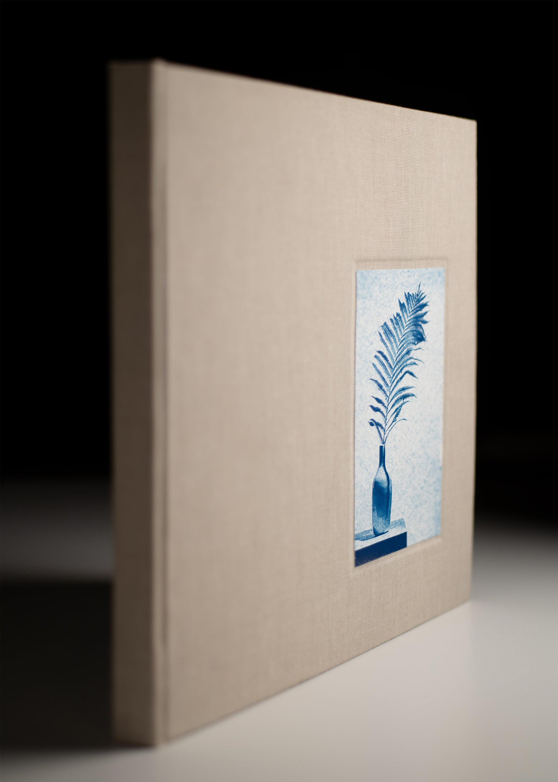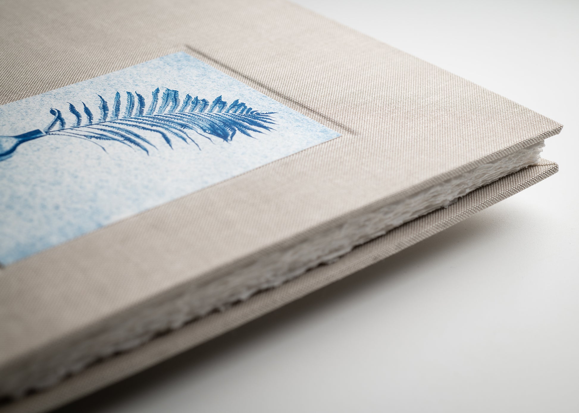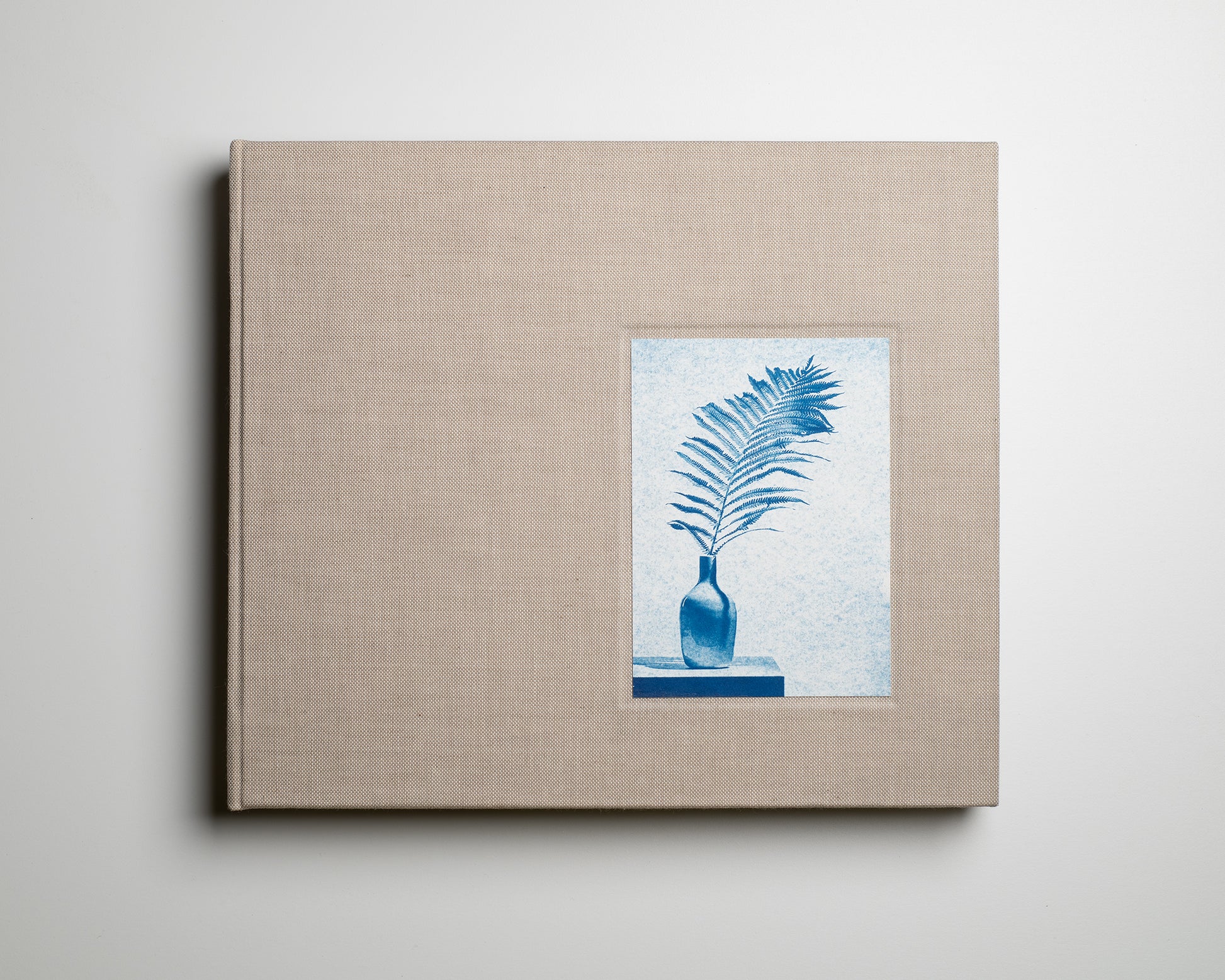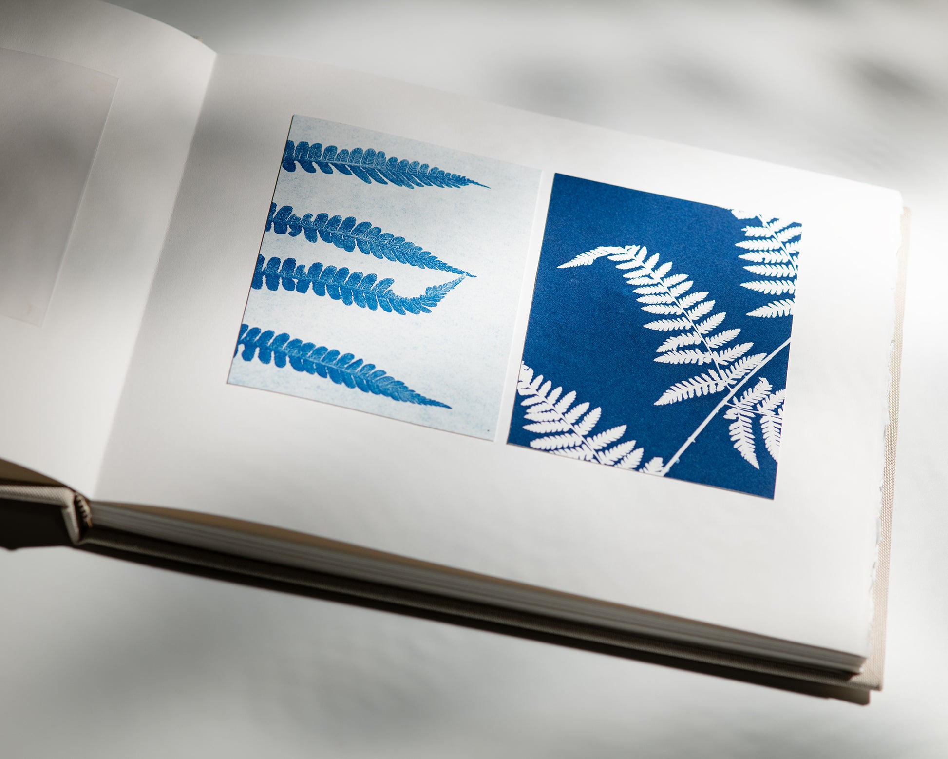Each left page displays a typewriter-typed thoughts/quotes about nature and conversation. Each right page displays a pairing of 4" x 6" original cyanotypes. Fern photographs made by Nat Caccamo in studio, digital negatives and cyanotypes created by Sarah Bourne Rafferty. Each and every page of this book is made my hand, the original images, the typewriter pages and the binding.