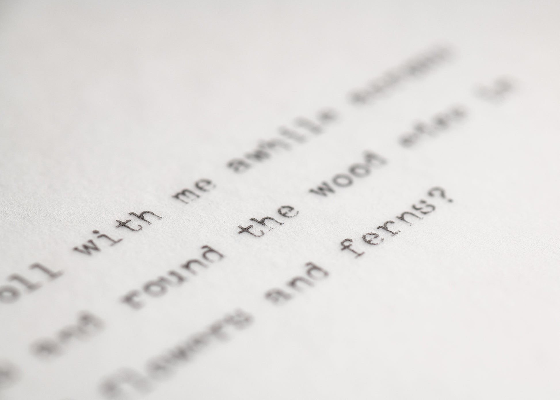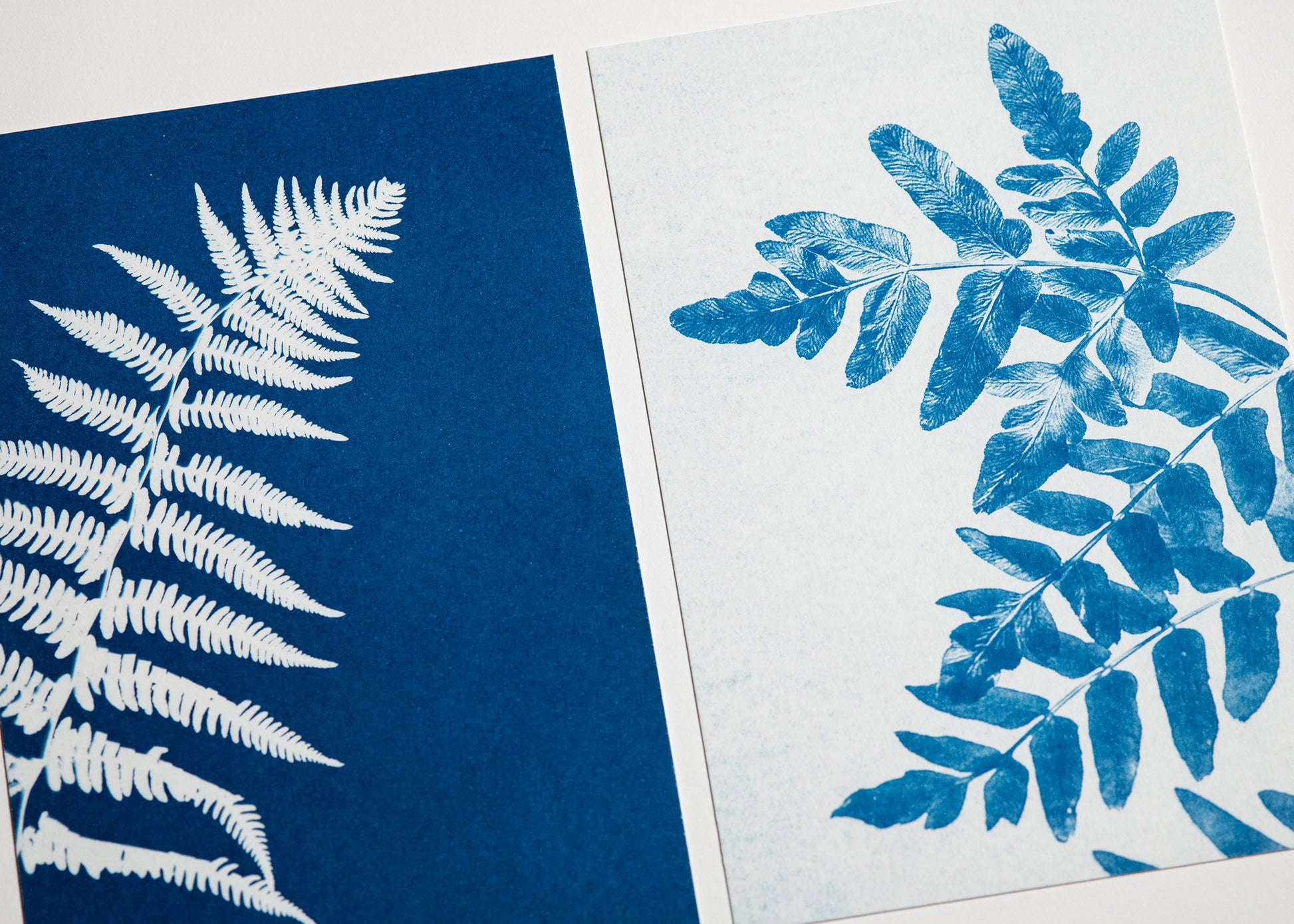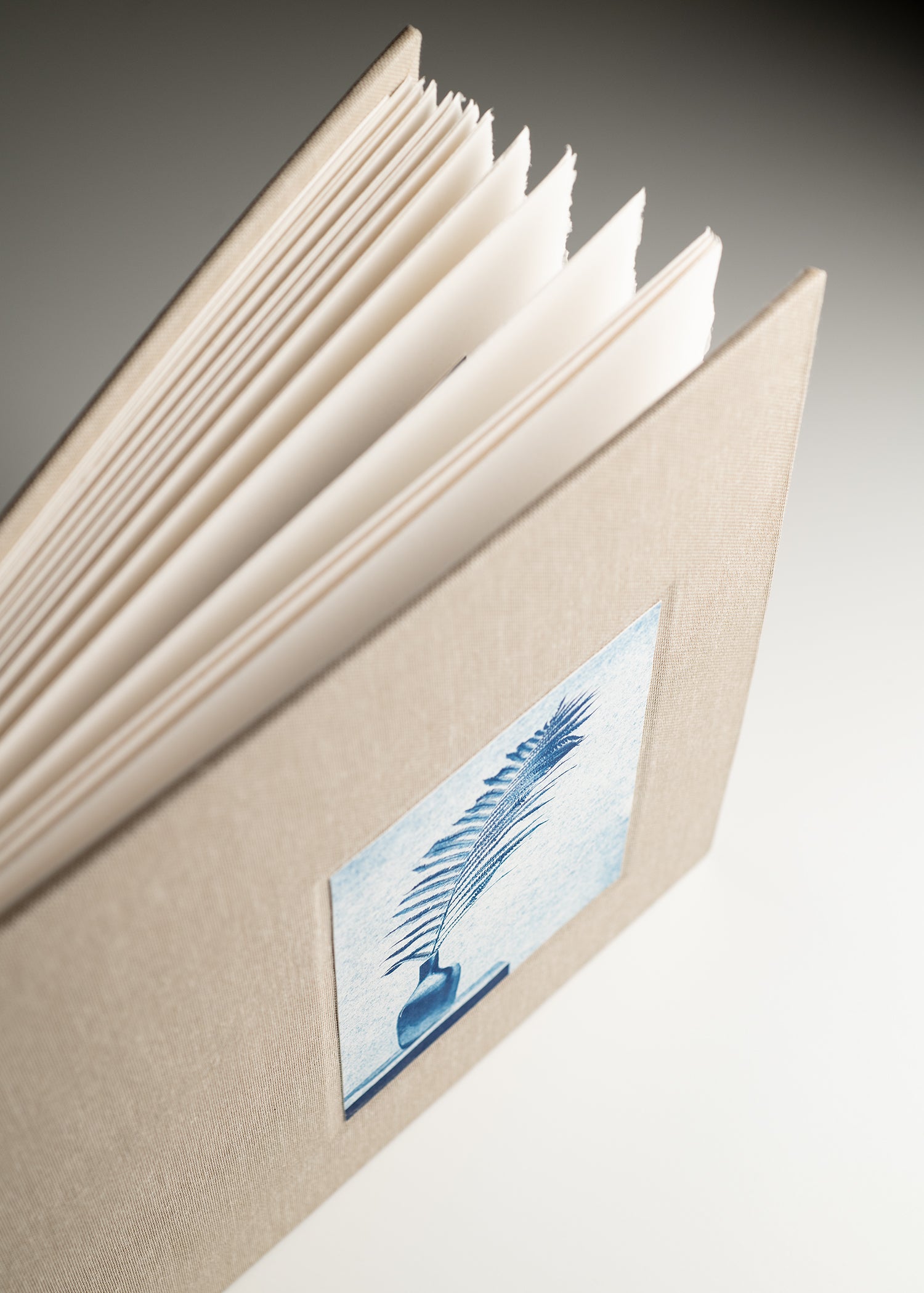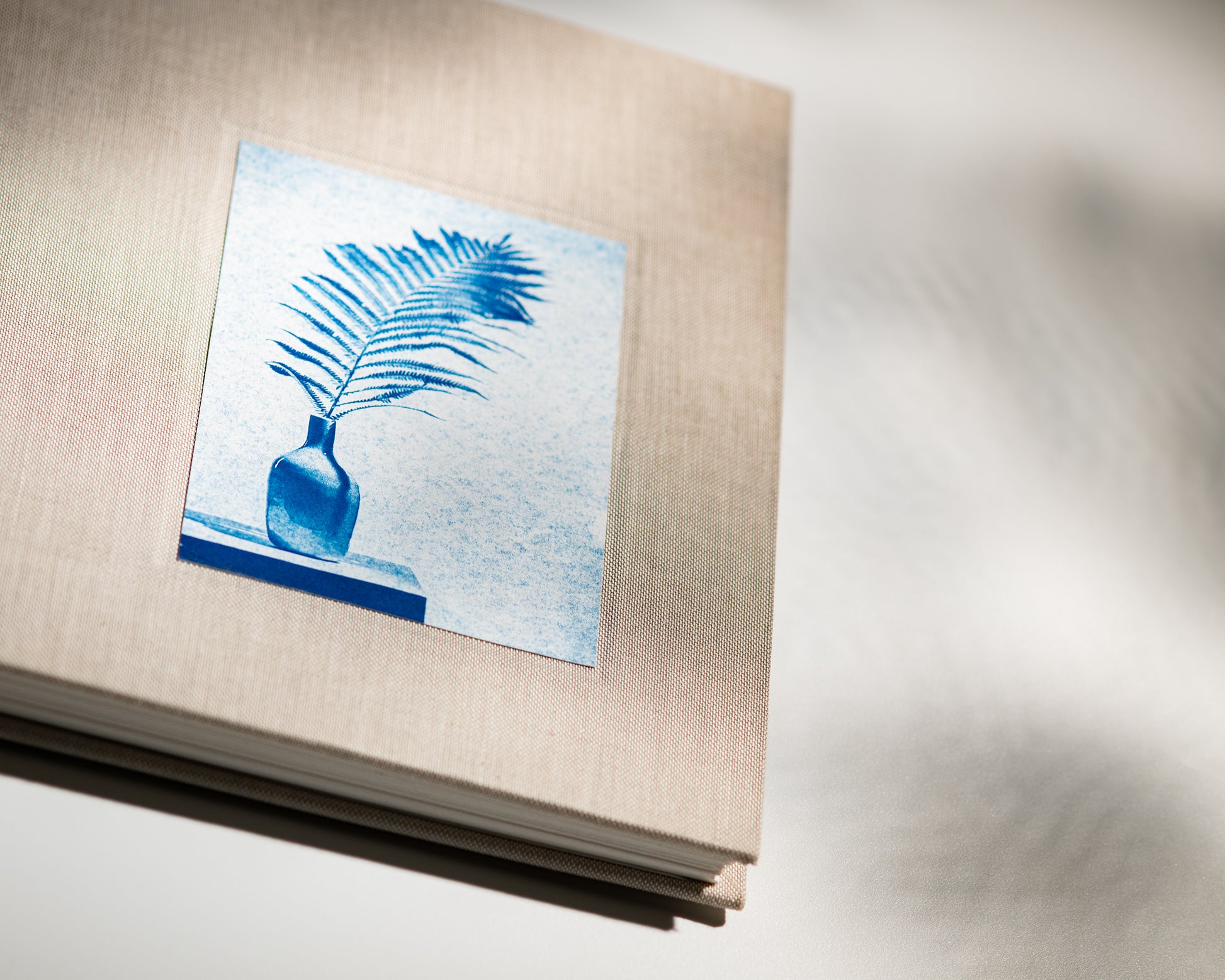 Each left page displays a typewriter-typed thoughts/quotes about nature and conversation. Each right page displays a pairing of 4" x 6" original cyanotypes. Fern photographs made by Nat Caccamo in studio, digital negatives and cyanotypes created by Sarah Bourne Rafferty. Each and every page of this book is made my hand, the original images, the typewriter pages and the binding.