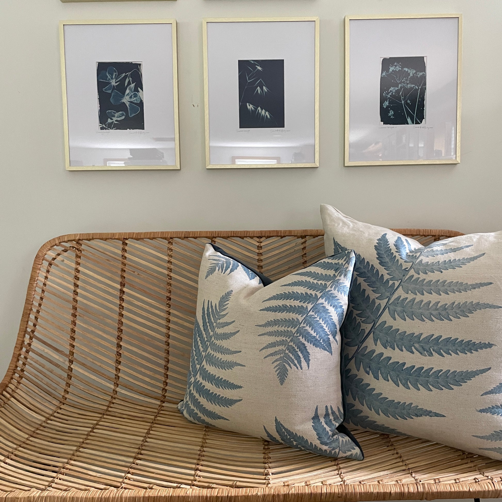 All pillows are made in Pennsylvania, from Sarah’s original cyanotypes, using linen from Belgium.
