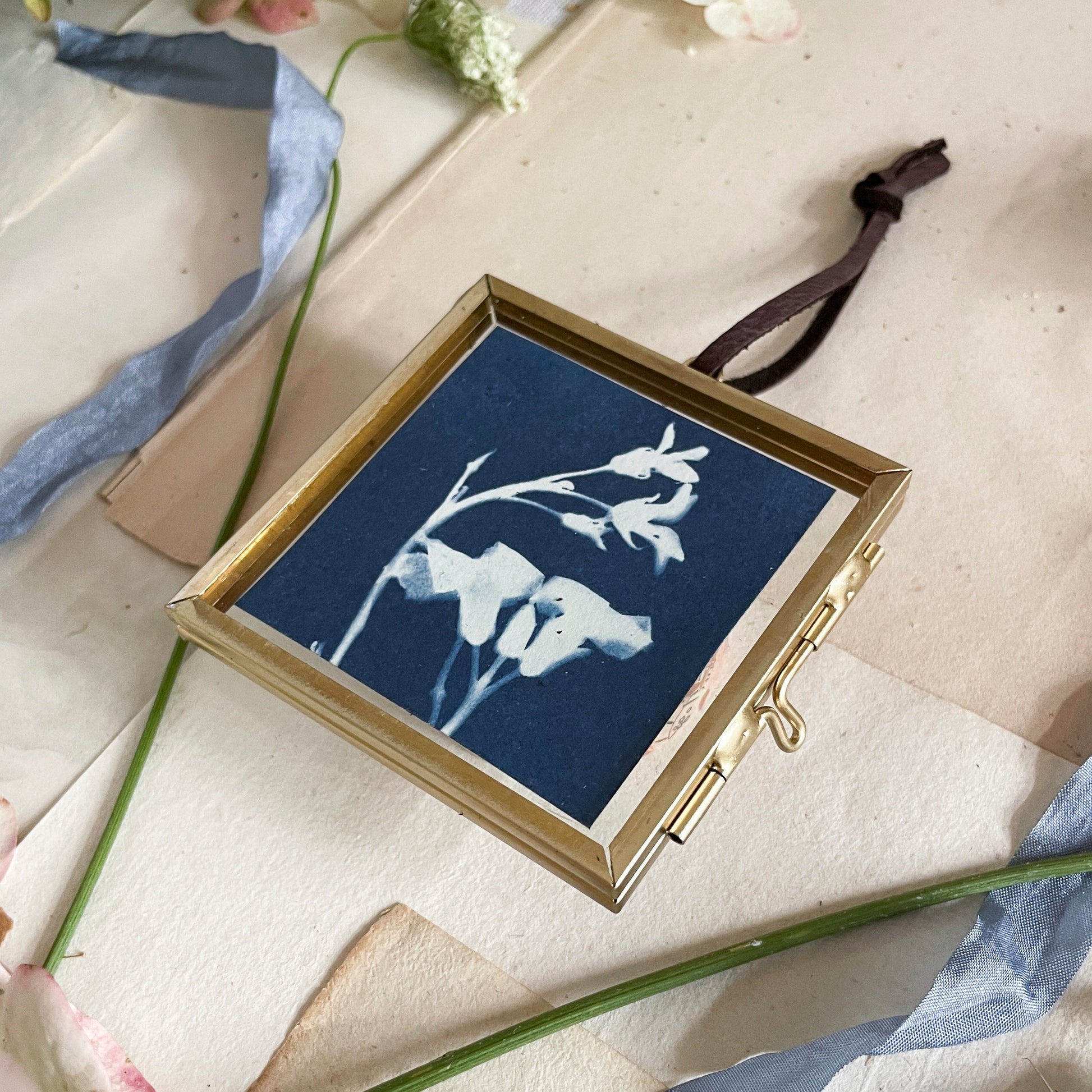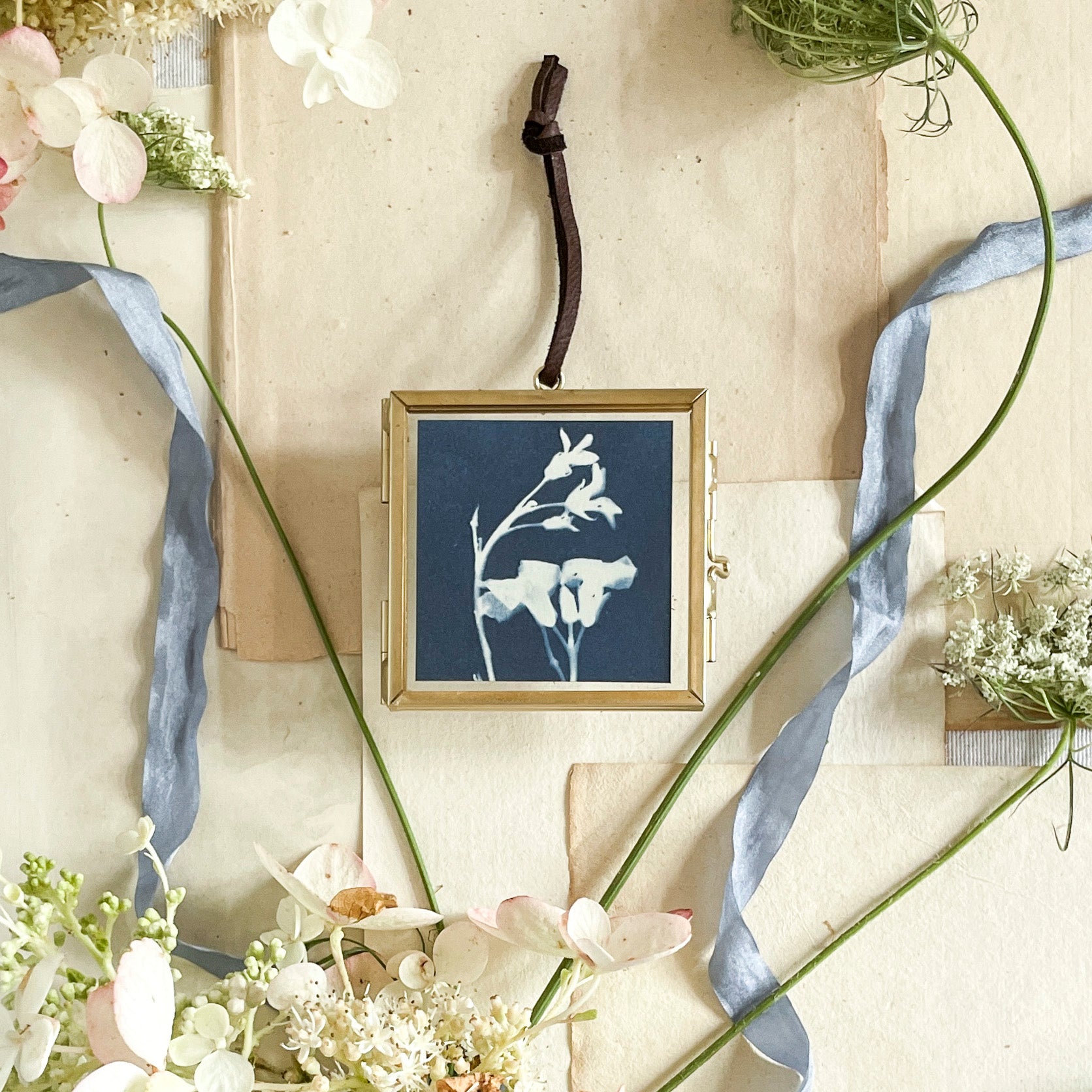 original, one-of-a-kind cyanotype framed in a metal frame with leather hanger