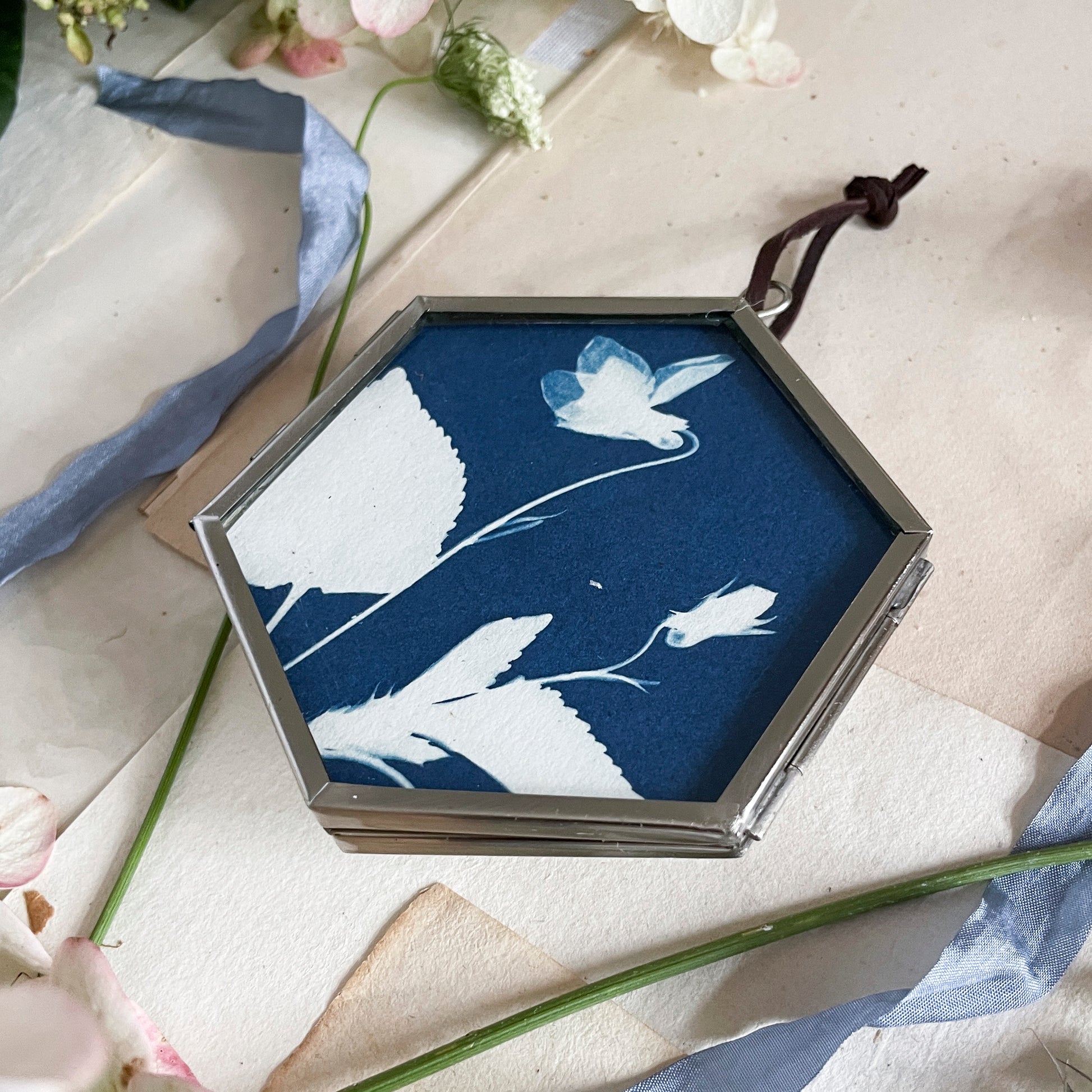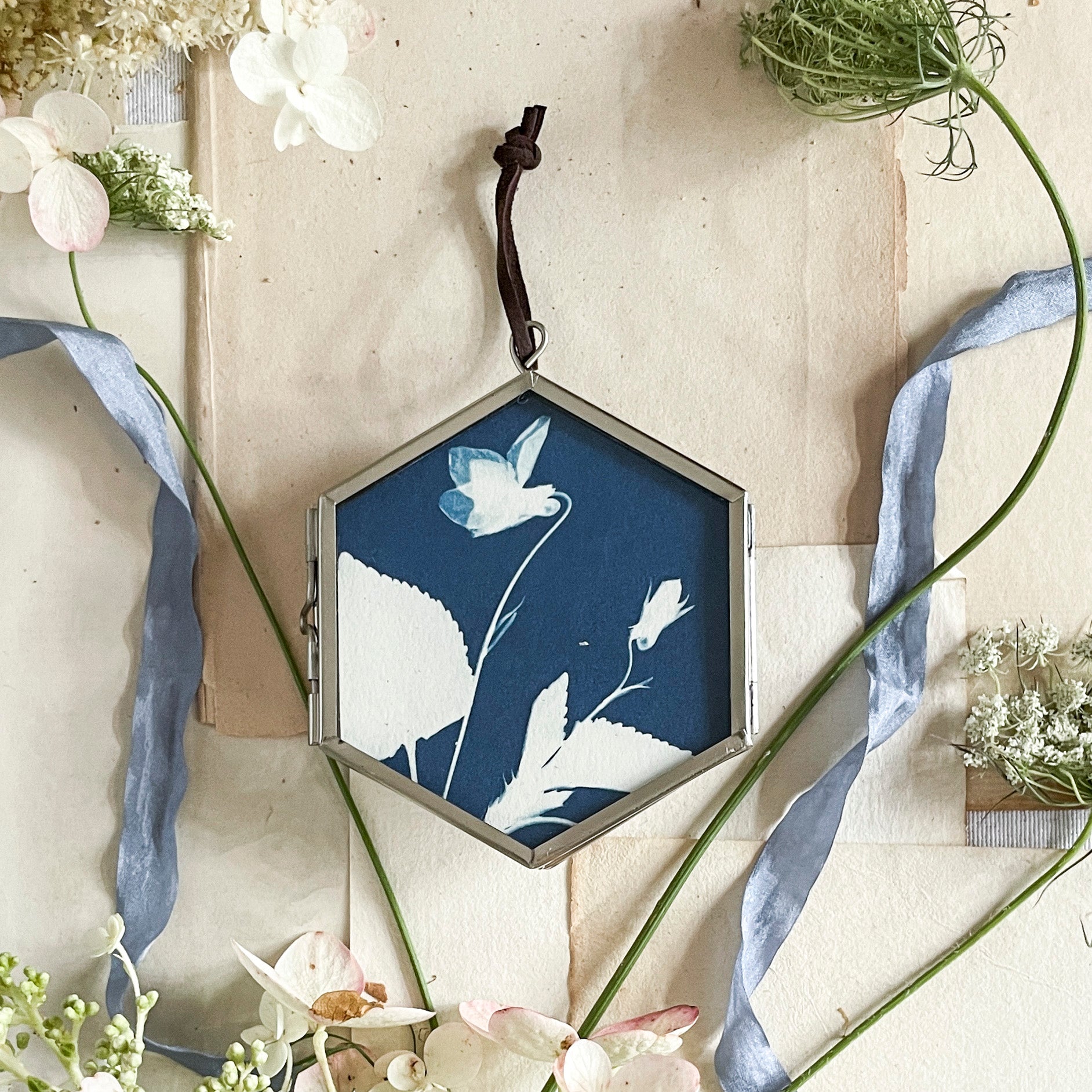 original, one-of-a-kind cyanotype framed in a metal frame with leather hanger