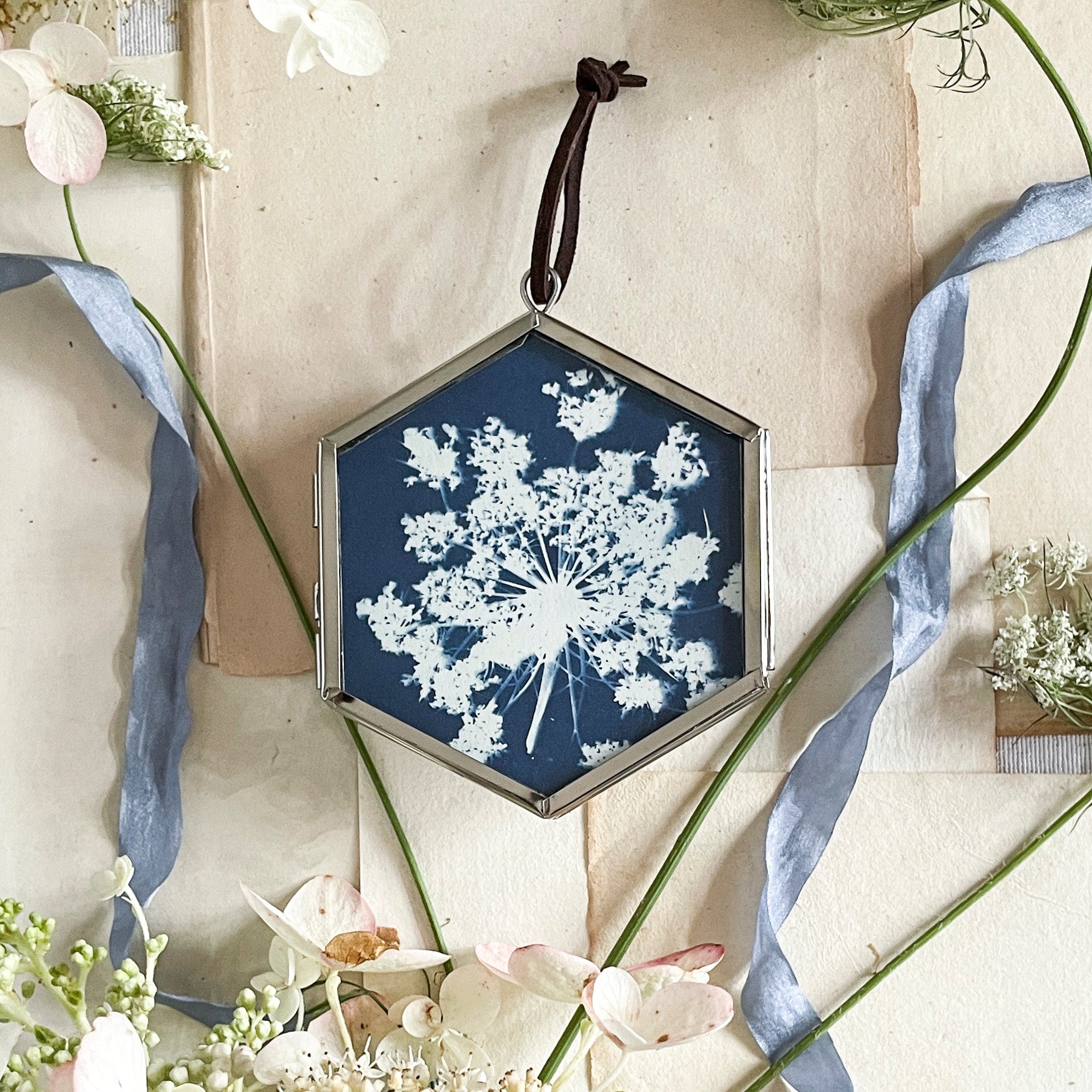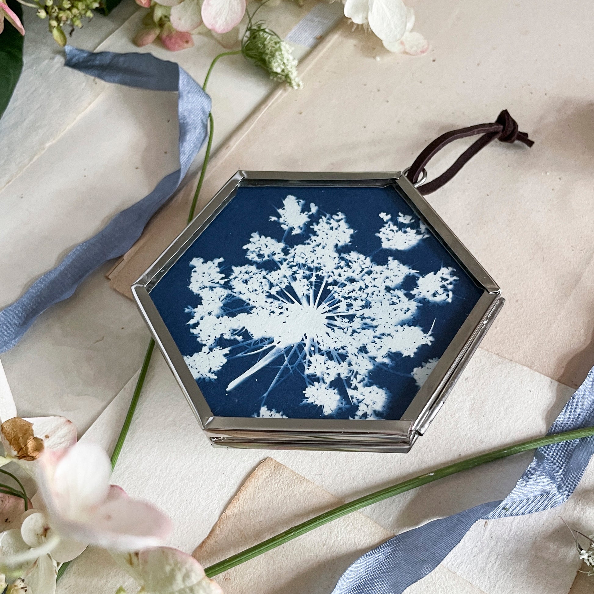 original, one-of-a-kind cyanotype framed in a metal frame with leather hanger