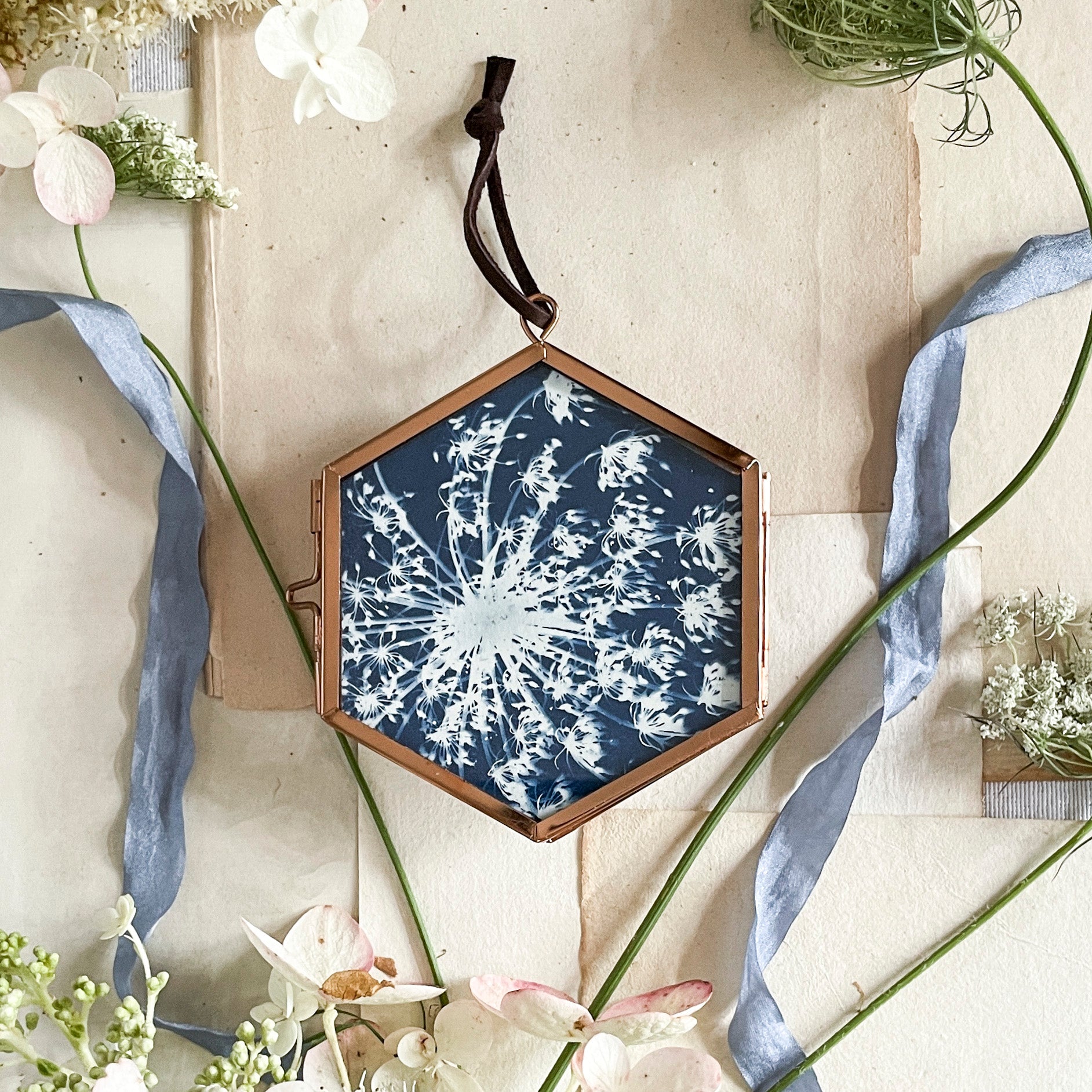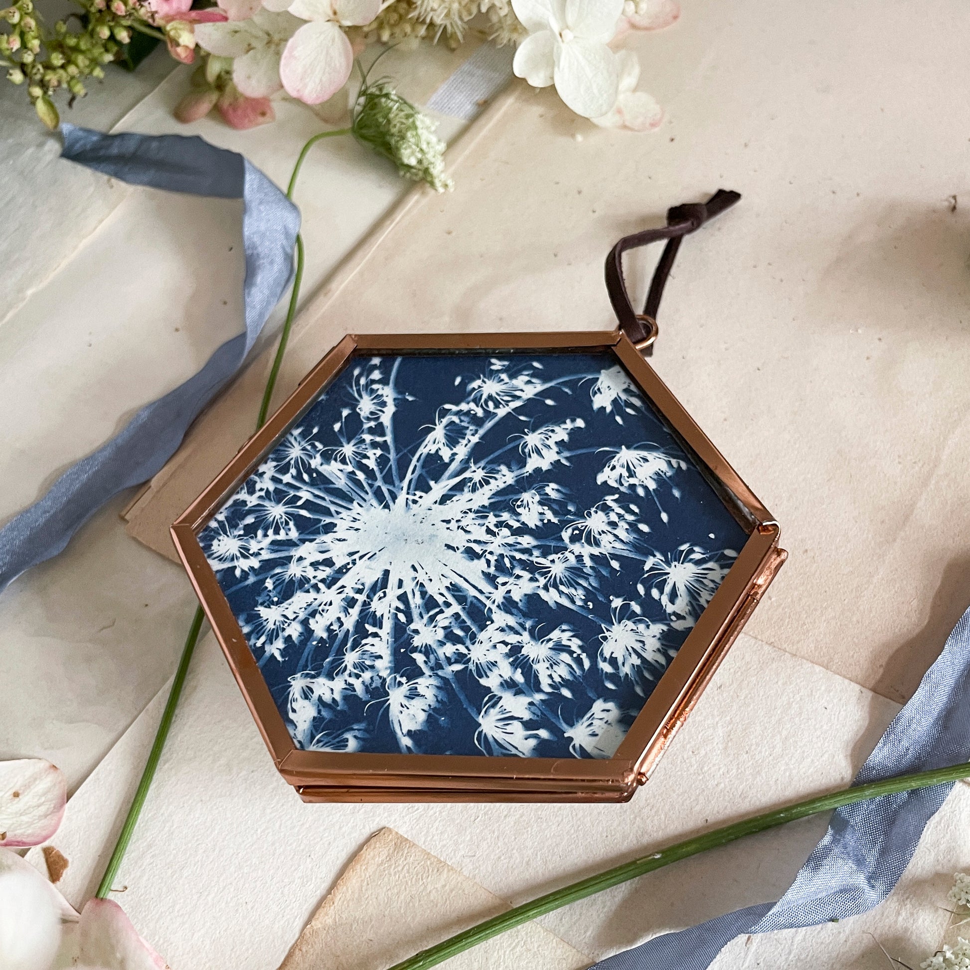 original, one-of-a-kind cyanotype framed in a metal frame with leather hanger