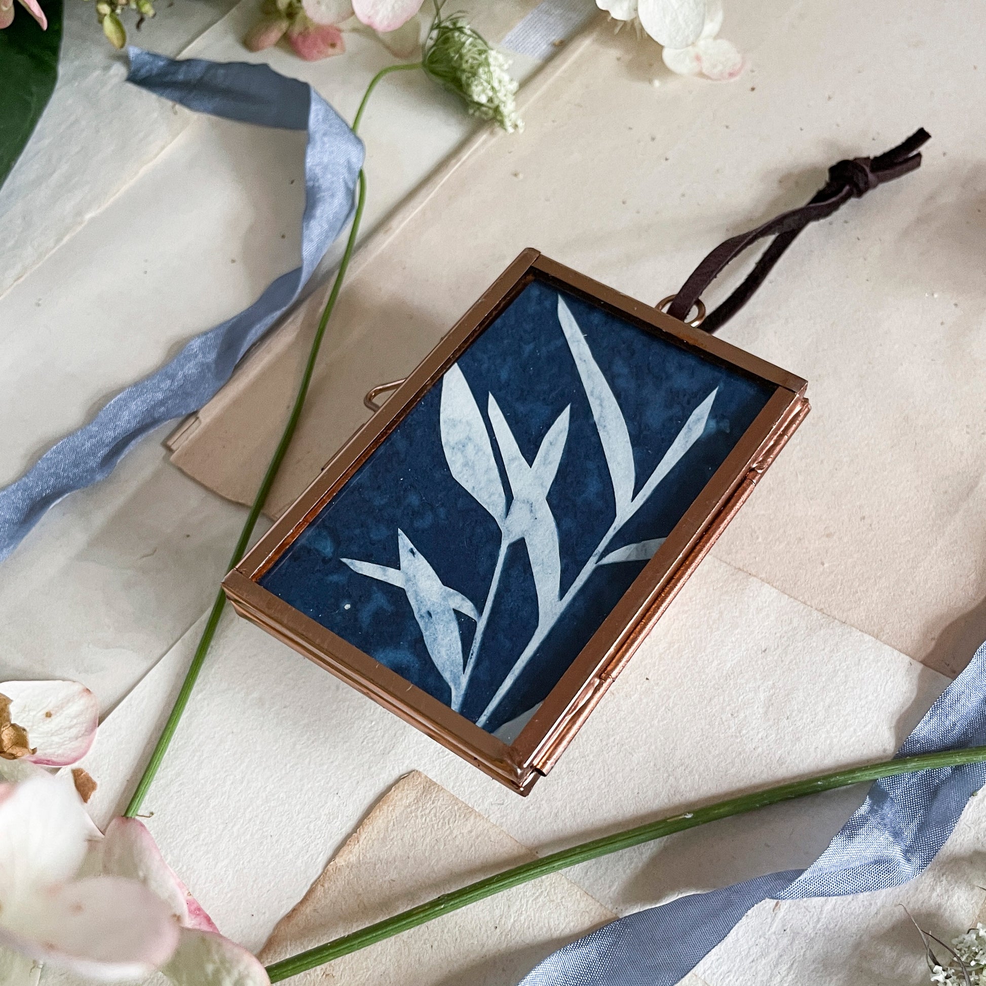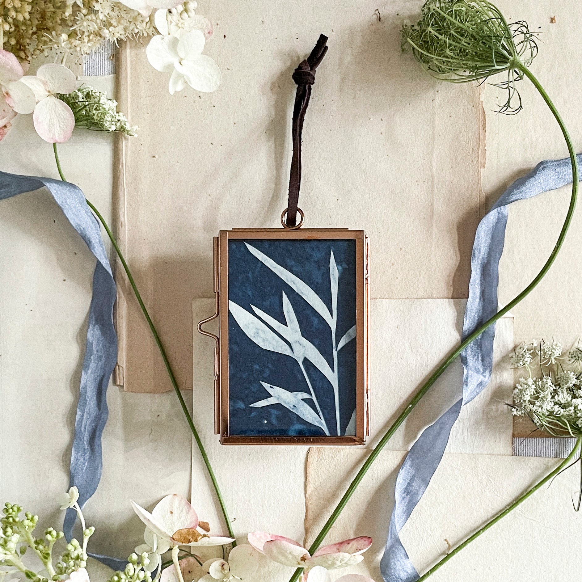 original, one-of-a-kind cyanotype framed in a metal frame with leather hanger