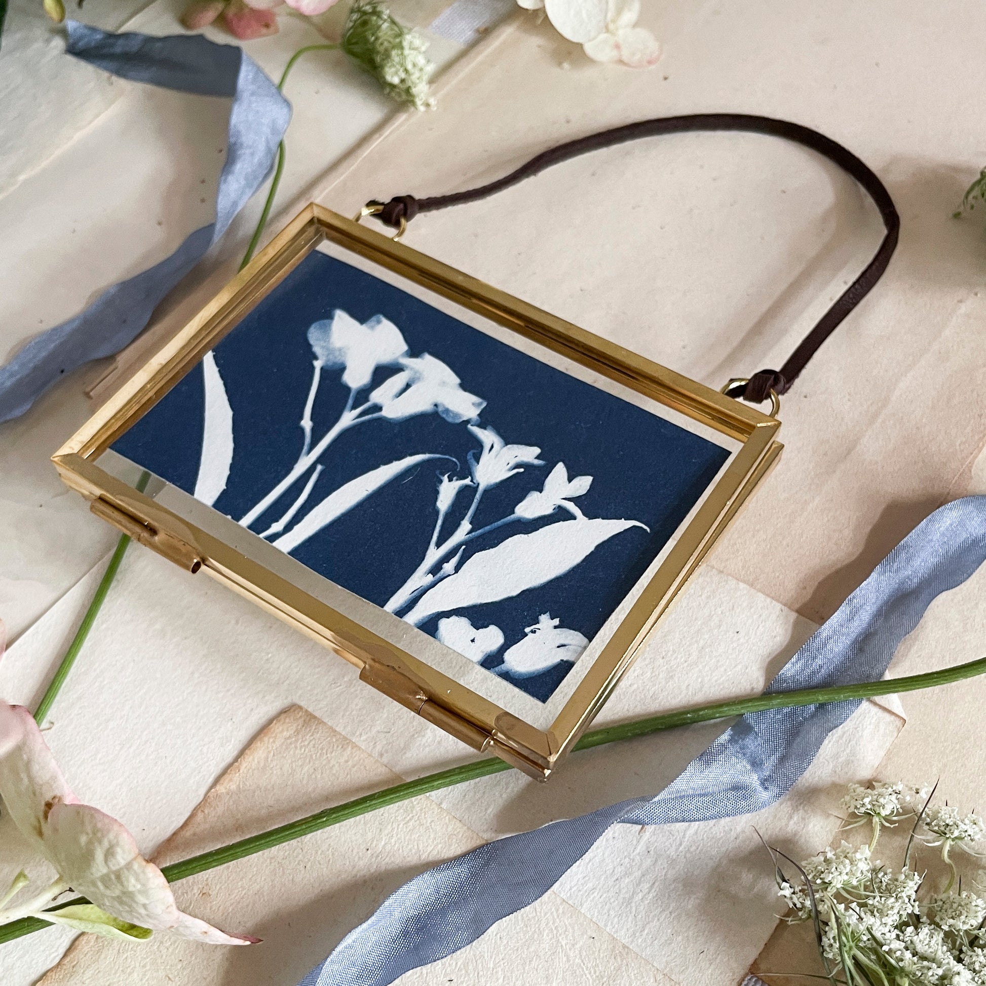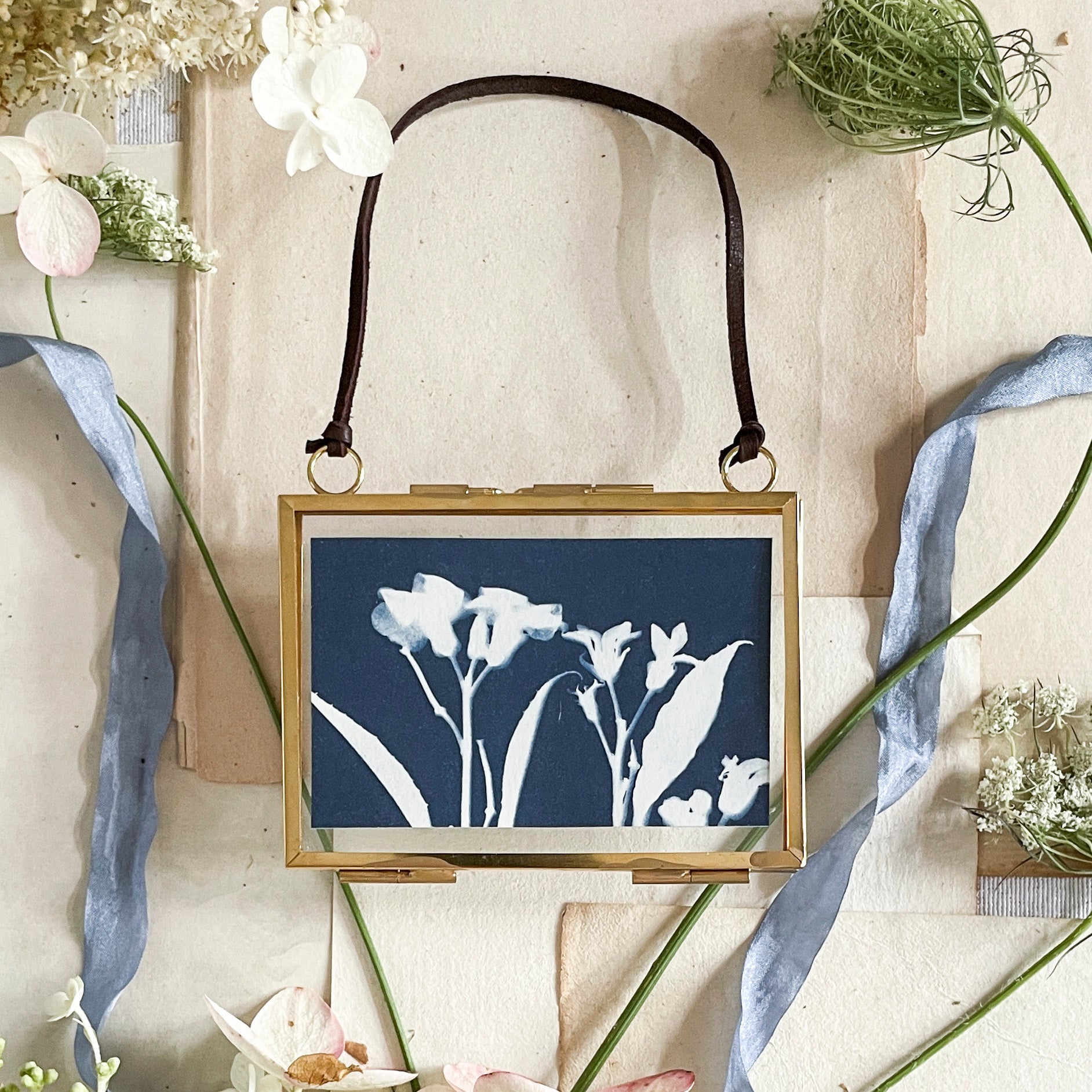 original, one-of-a-kind cyanotype framed in a metal frame with leather hanger