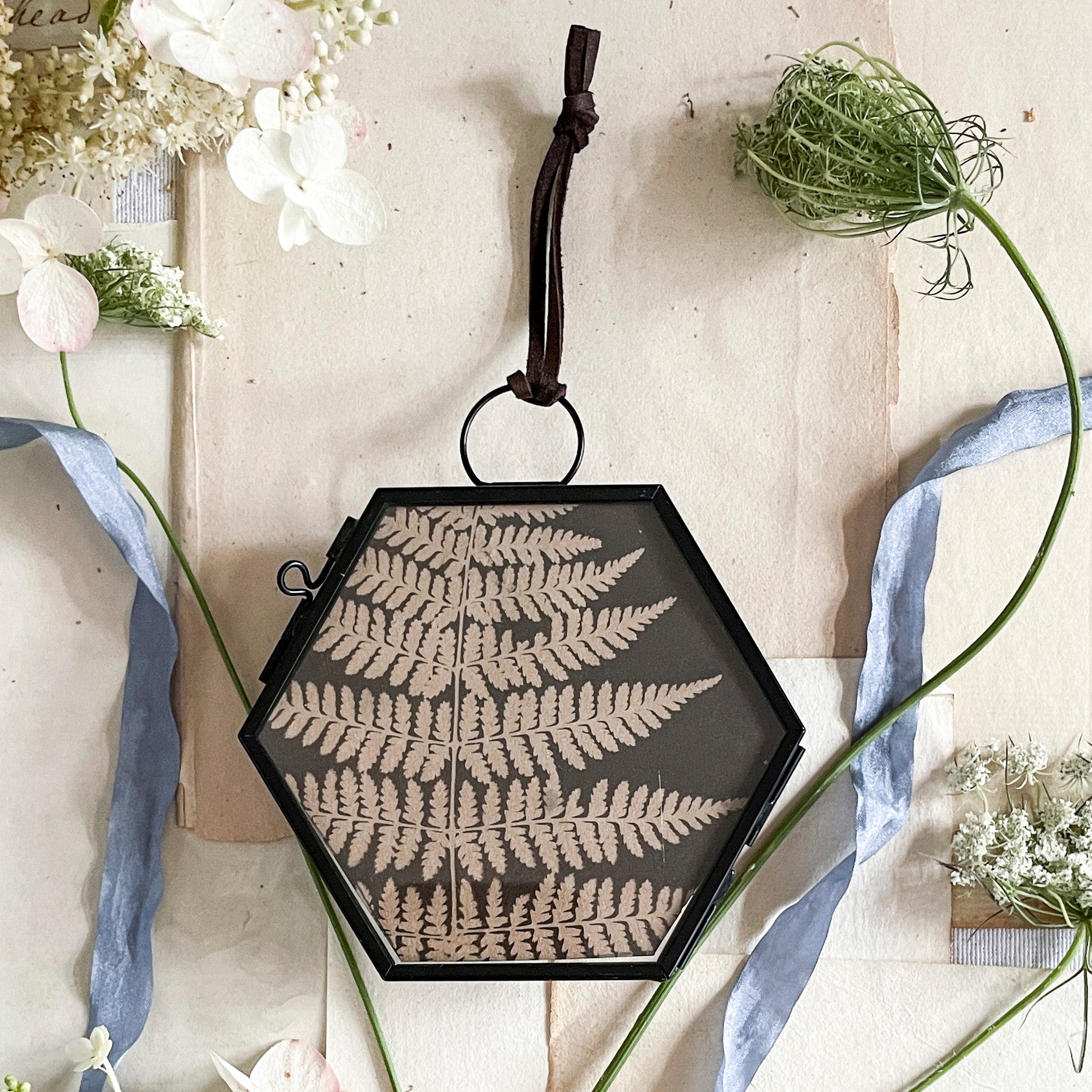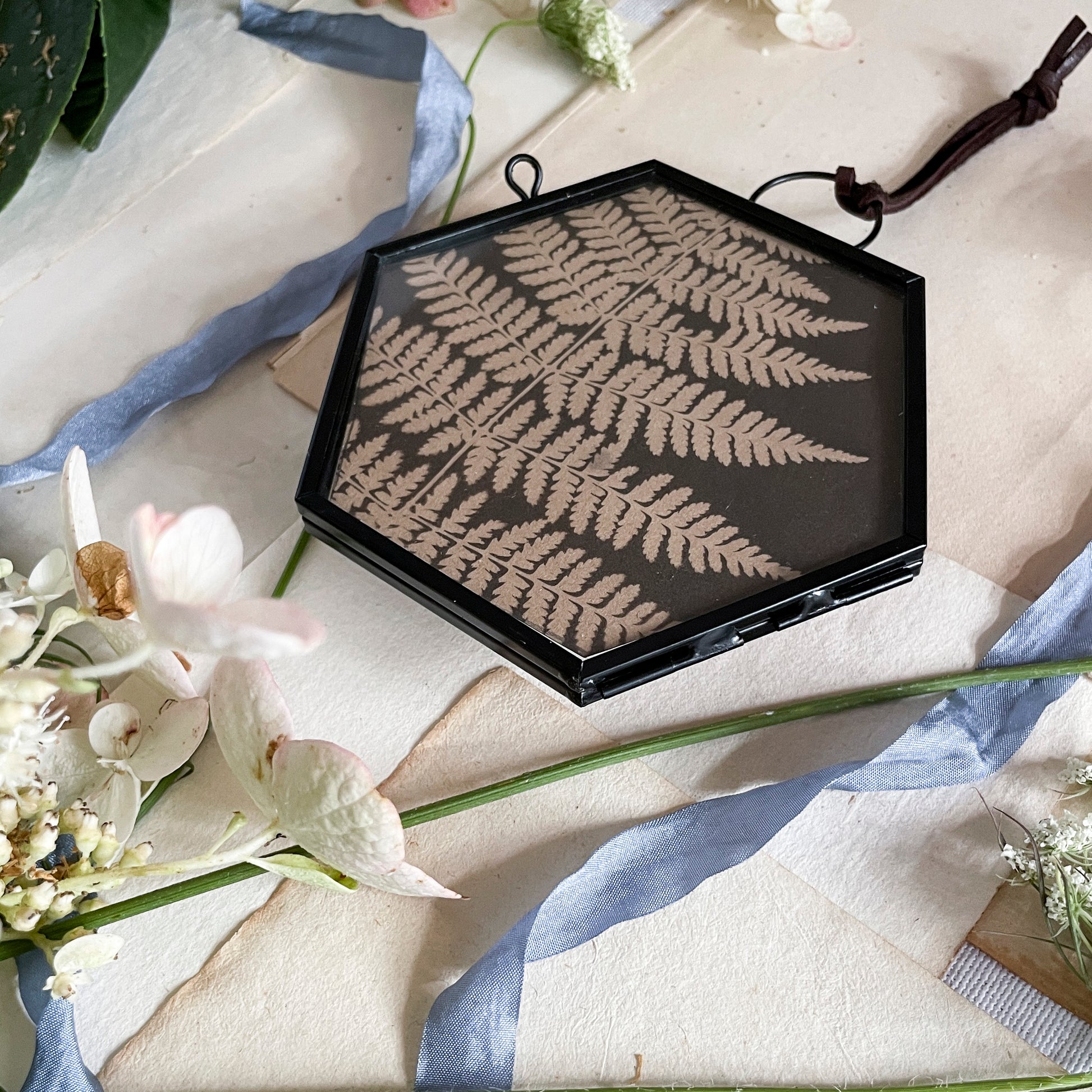 original, one-of-a-kind cyanotype framed in a metal frame with leather hanger