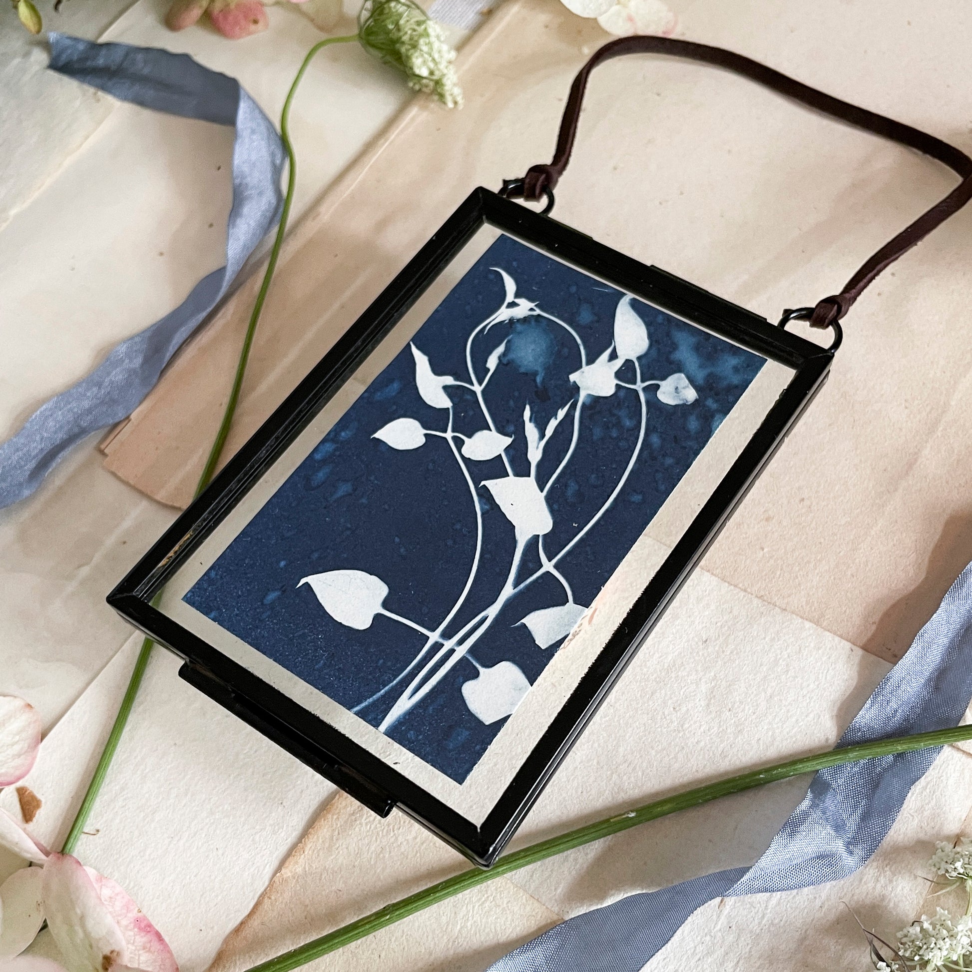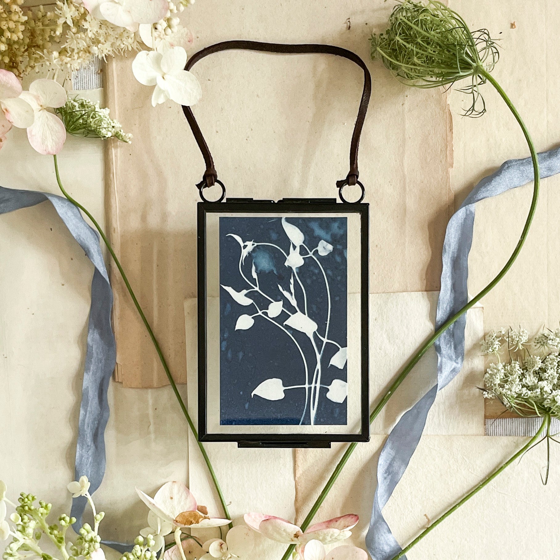 original, one-of-a-kind cyanotype framed in a metal frame with leather hanger