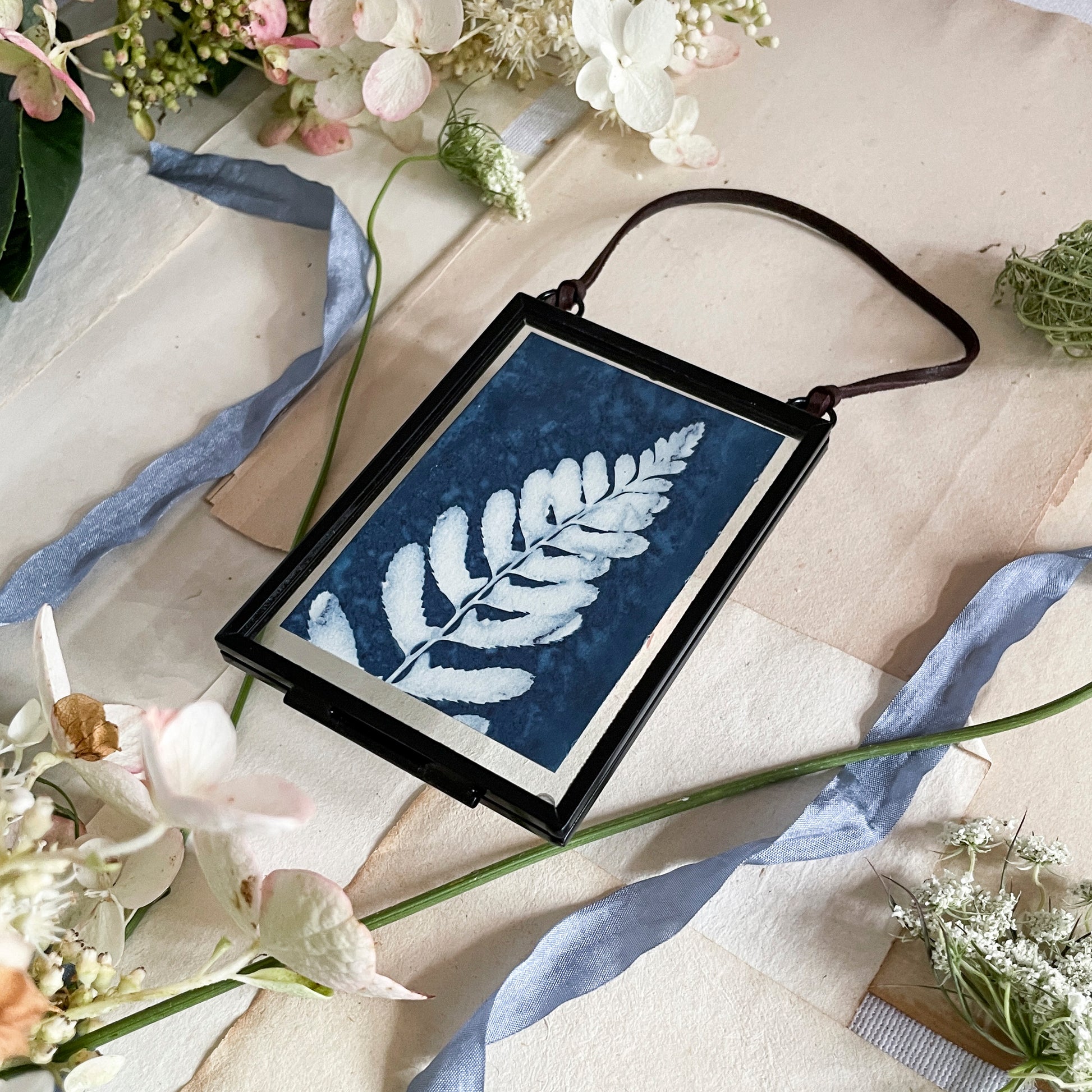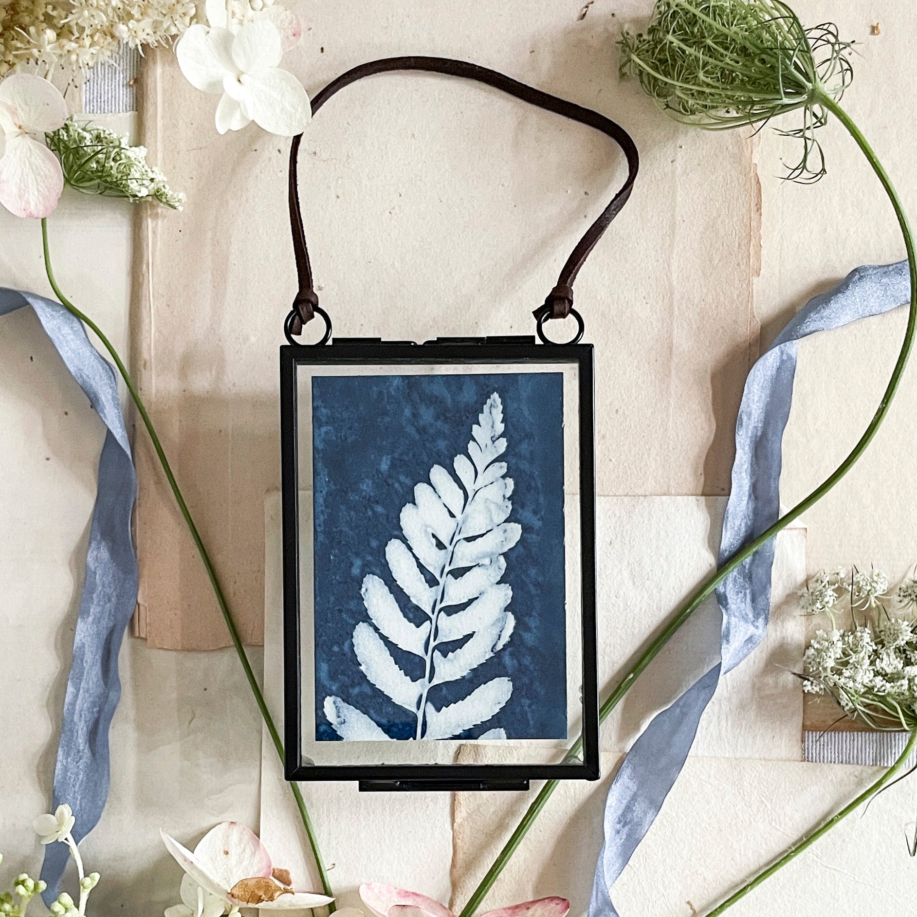 original, one-of-a-kind cyanotype framed in a metal frame with leather hanger