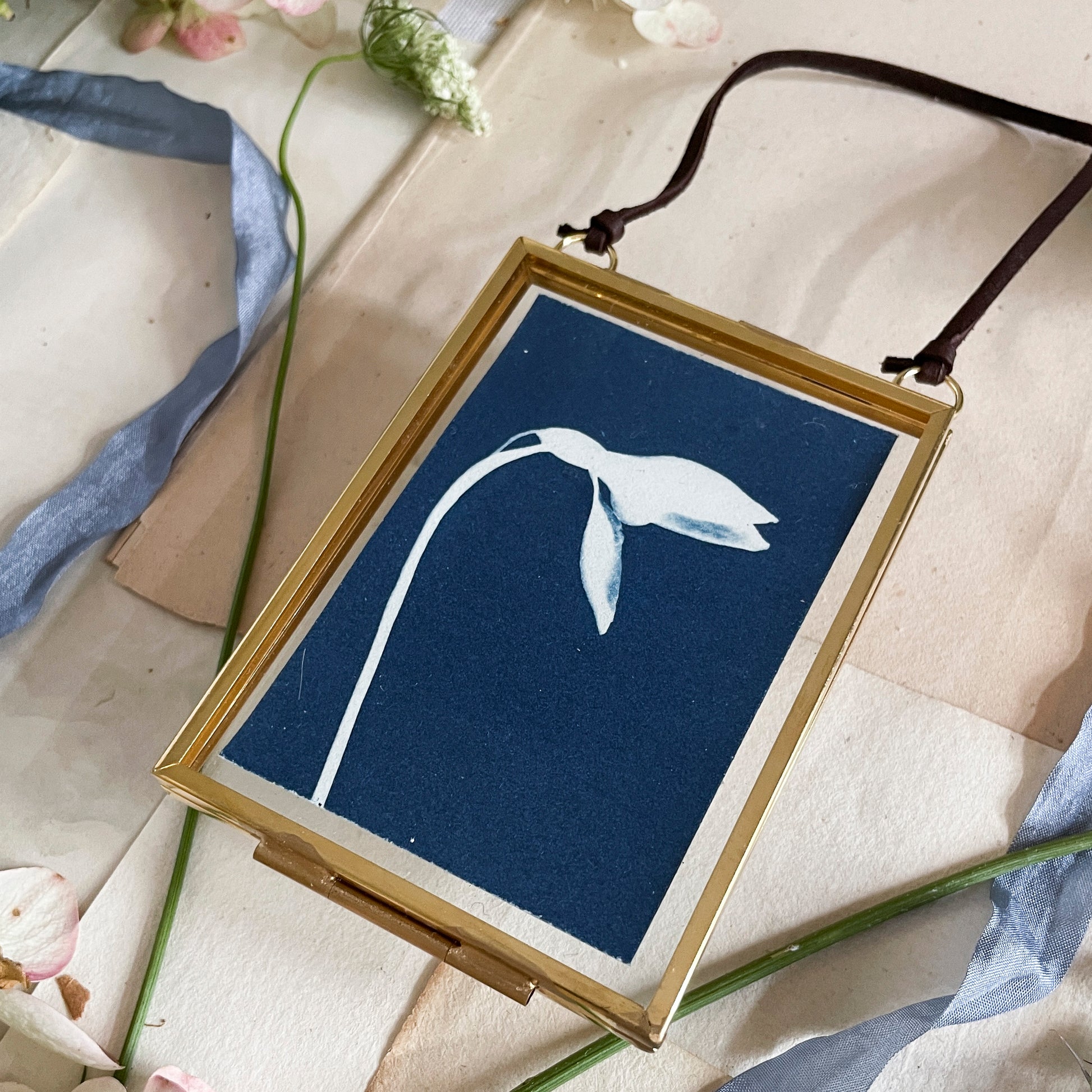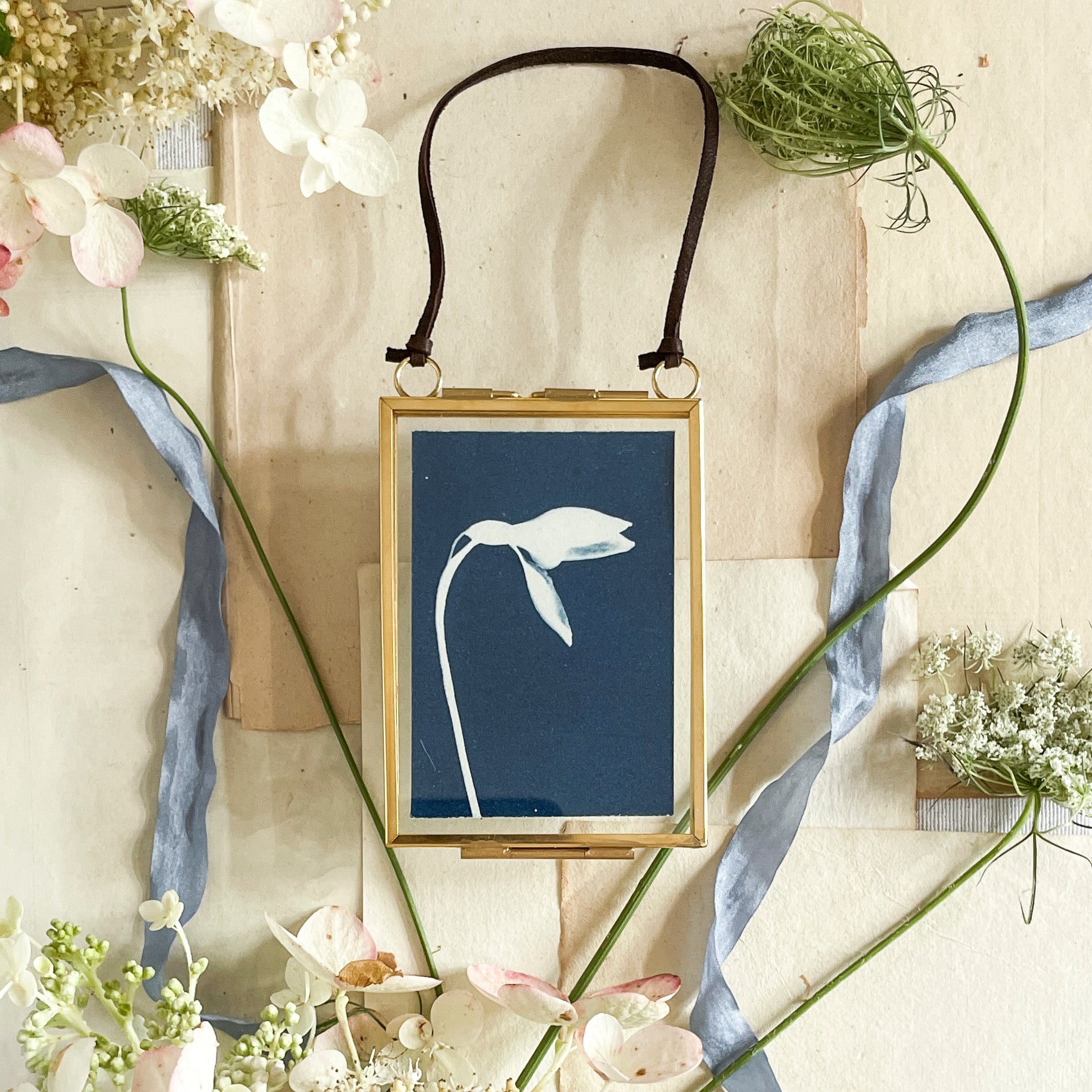original, one-of-a-kind cyanotype framed in a metal frame with leather hanger