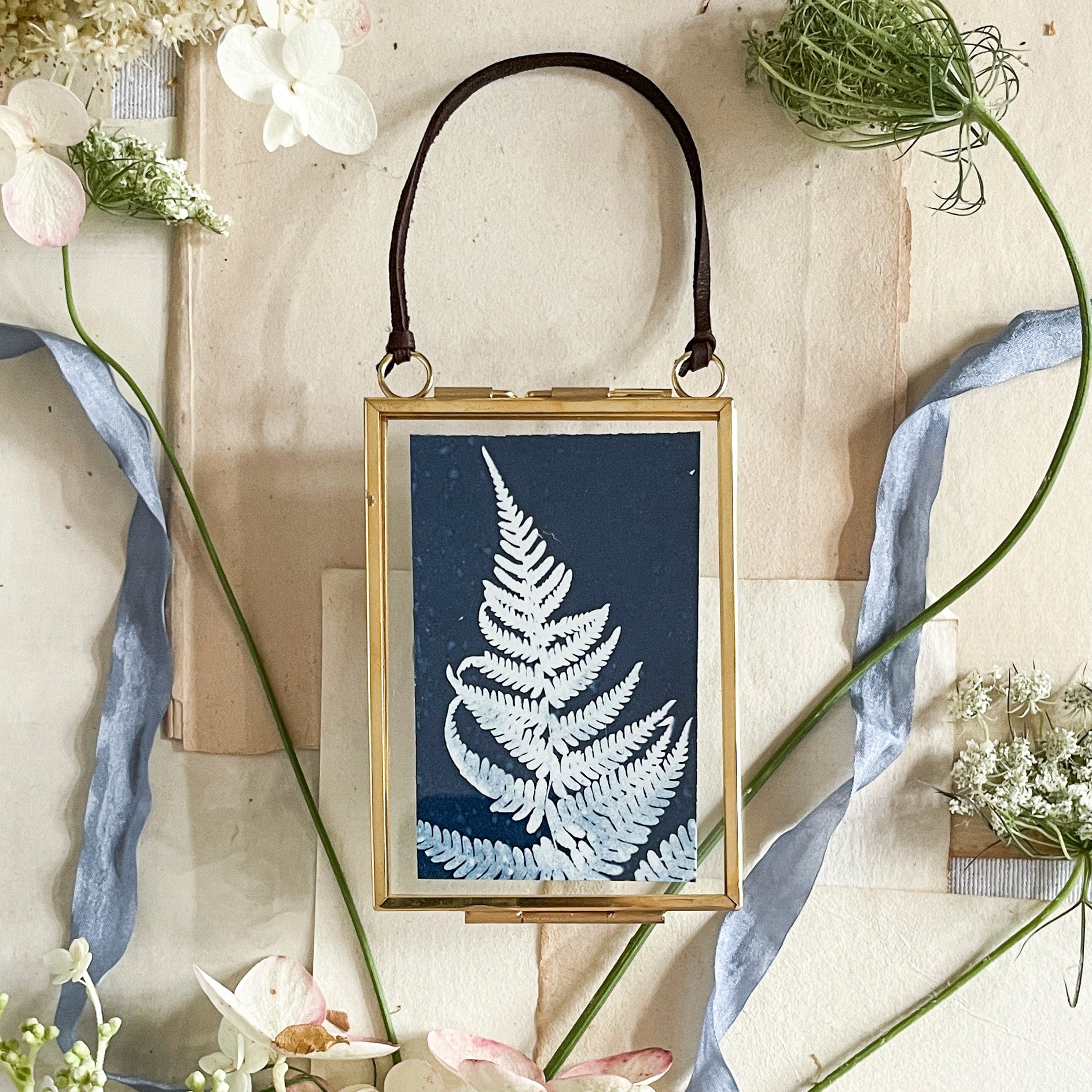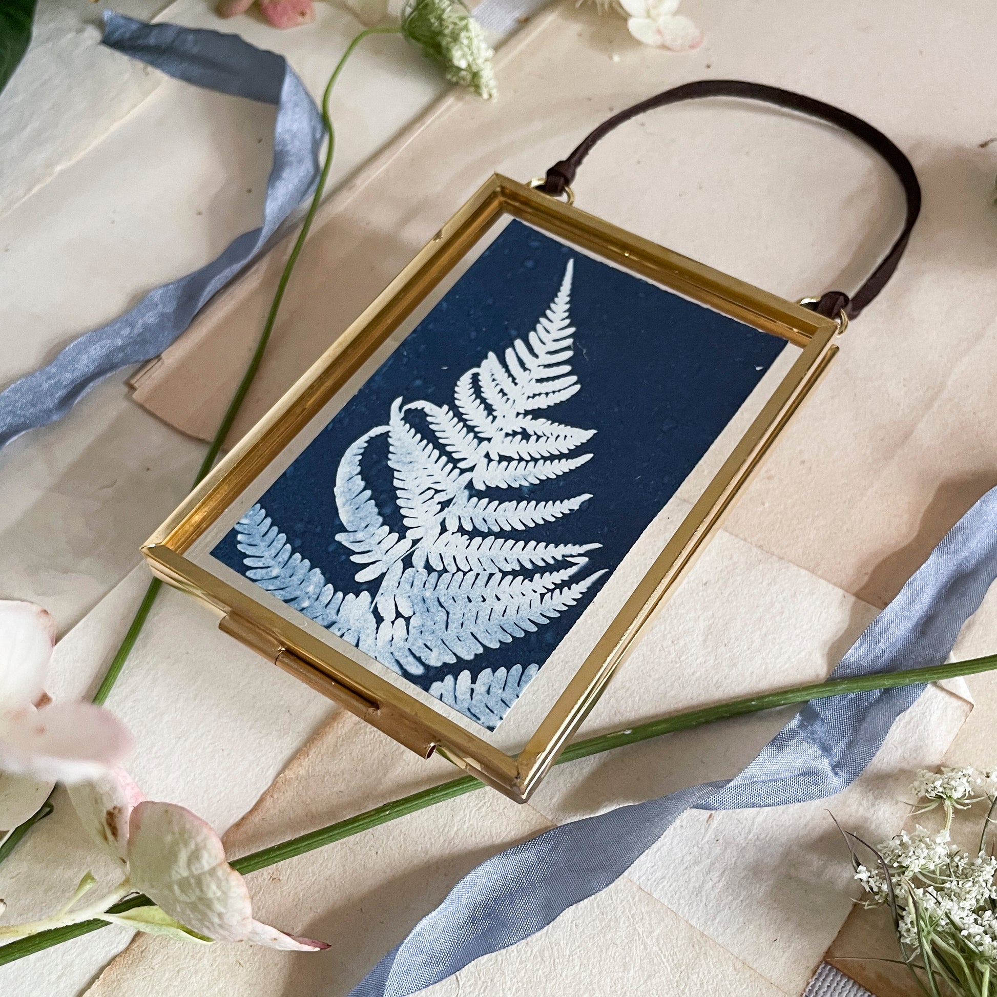 original, one-of-a-kind cyanotype framed in a metal frame with leather hanger