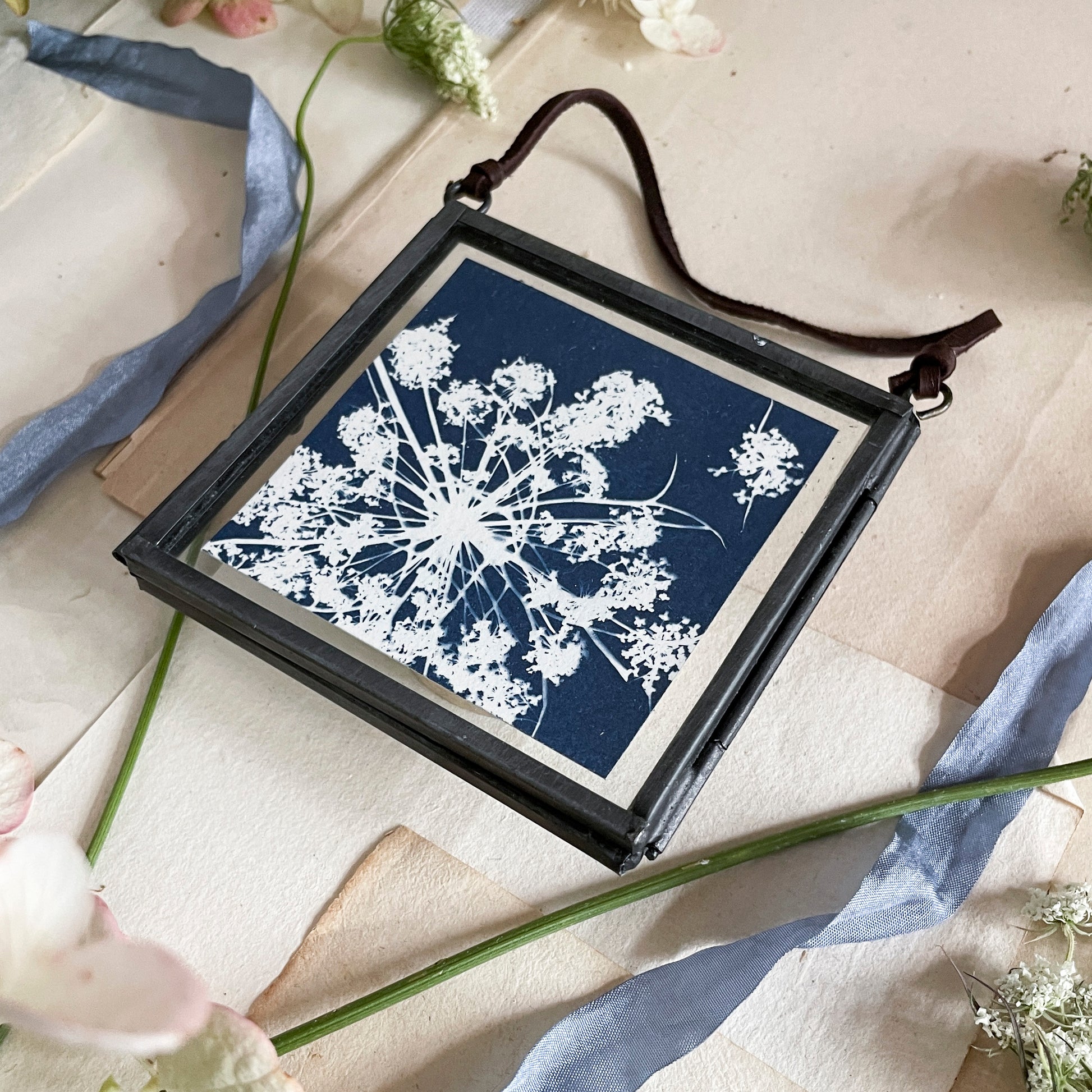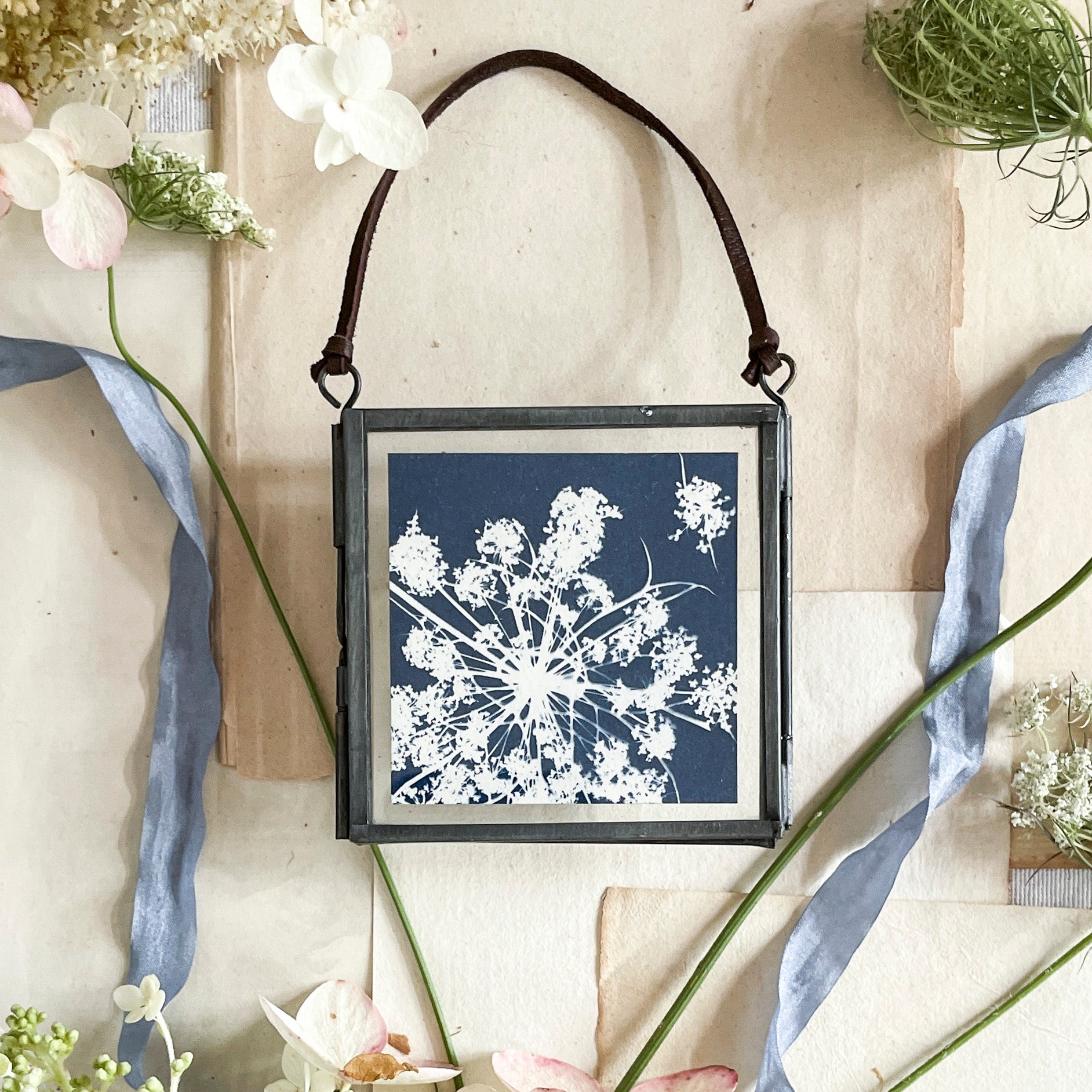 original, one-of-a-kind cyanotype framed in a metal frame with leather hanger