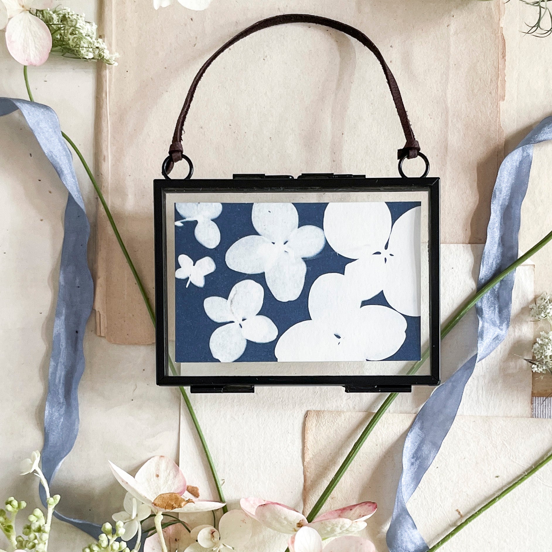 original, one-of-a-kind cyanotype framed in a metal frame with leather hanger