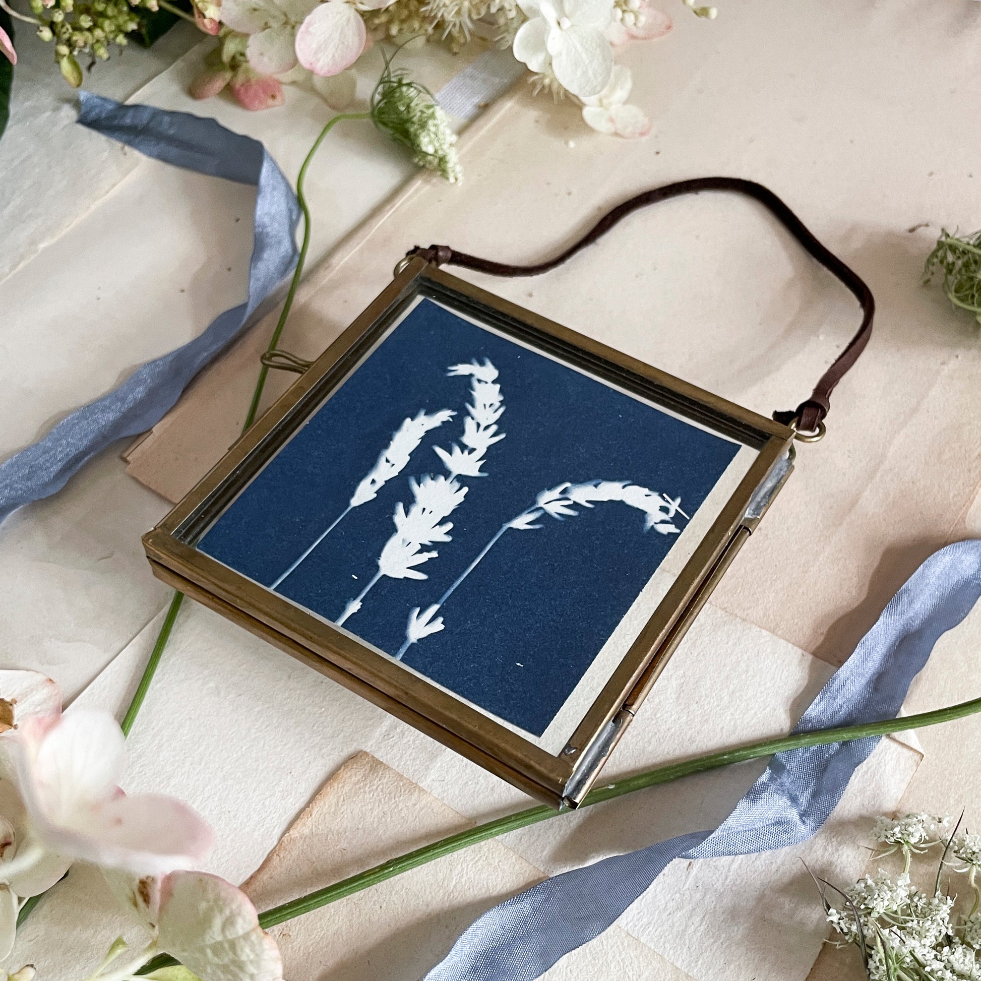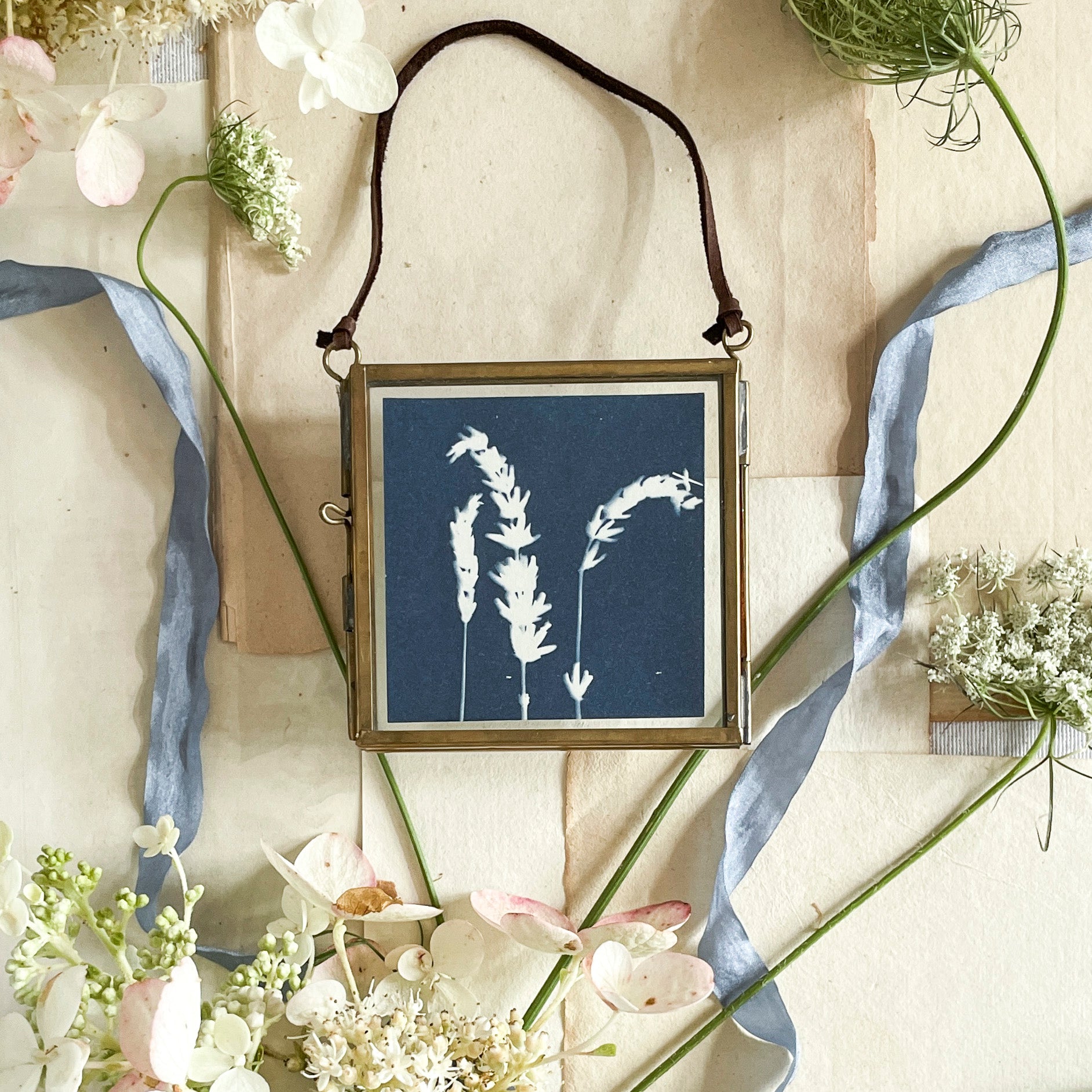 original, one-of-a-kind cyanotype framed in a metal frame with leather hanger