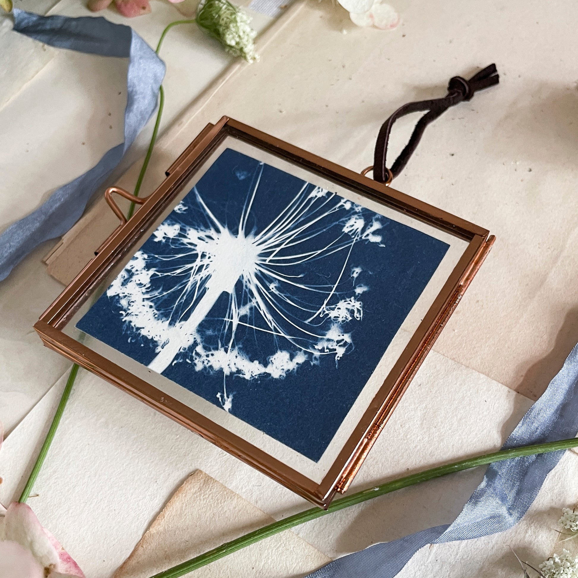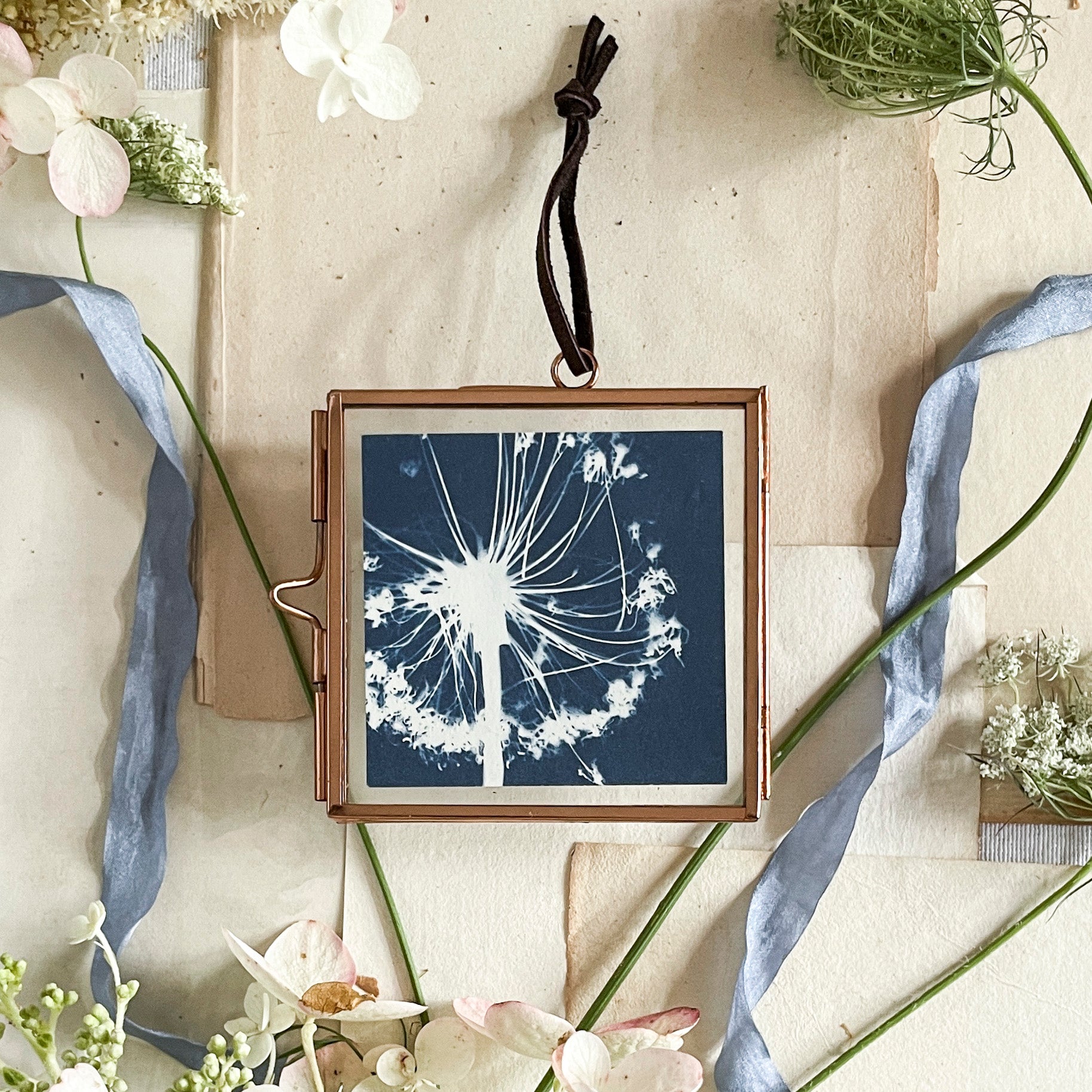 original, one-of-a-kind cyanotype framed in a metal frame with leather hanger