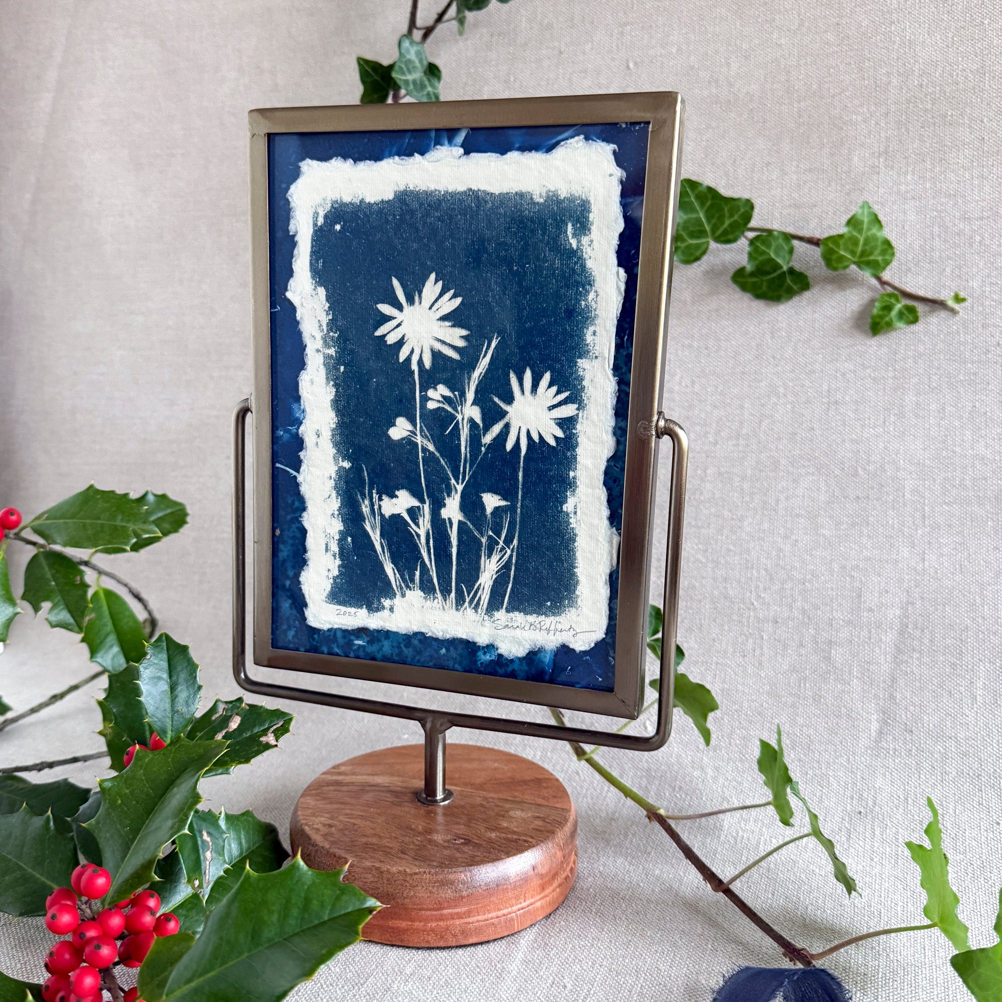 Original 5" x 7" cyanotype of Queen Anne's Lace from our little plot of land here in Chester County, PA and framed in a brass frame measuring 5.5" x 7.5" and stands 10" high. Shown here next to a 4.5" x 4.5" frame in the same style.