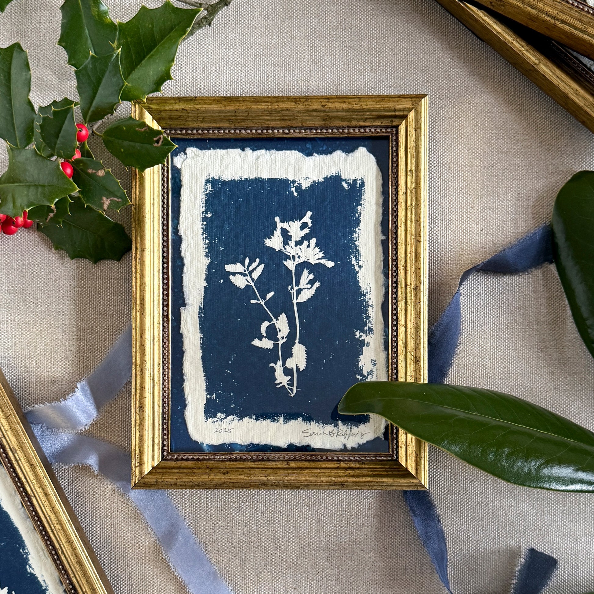 Original 5" x 7" cyanotype from our little plot of land here in Chester County, PA. Created on handmade paper, backed on another cyanotype to create a blue border and framed in a gold frame. Can be hung on the wall or placed on tabletop.